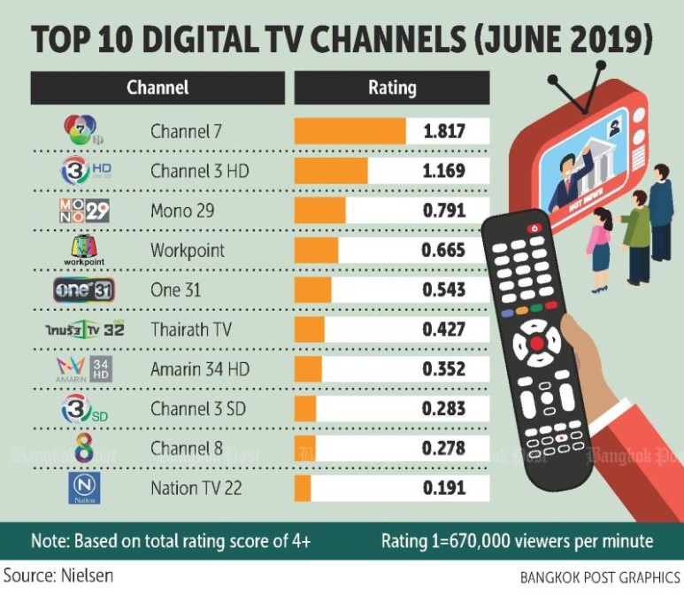 기업 마케팅과 광고에 밀접한 관련이 있는 태국의 시청률 조사 시스템이 확 바뀐다.태국 방송통신위원회(NBTC)는 오늘 8월부터 기존 방식을 대체할 새로운 시청률 조사 시스템을 론칭할 계획으로 7월 25일 기업, 학계, 방송 관계자들이 참여하는 토론회를 열 계획이다.새로운 시청률 조사 방법은 기존 지상파뿐 아니라 유튜브, 넷플릭스 등 OTT 플랫폼과 온라인TV 등 디지털 방식까지 포함한다는 계획이다. 태국 방송통신위원회는 시청률 표본가구를 13만 가구까지 늘려 올해 말까지 20만 가구까지 확대할 방침이다.전반적으로 재정 상태가 양호하지 않은 신규 디지털 사업자들은 기존 시청률 조사 방식이 새로운 트렌드인 온라인 TV 시청에 대한 통계가 포함되지 않는다며 희망을 제기해왔다.한편 현재 태국시청률 조사기관인 닐슨에 따르면 2019년 6월 현재 태국TV시청률 순위 Top10은 채널7, 채널3HD, 사물에 이어 워크포인트, 원, 타이라트, 아마린, 채널3SD, 채널8, 네이션TV 순이었다.