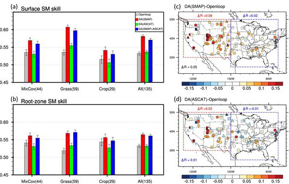 자료 동화 시스템을 통해 생산된 토양 수분 변수의 성능 비교. a. 지면 자료 동화를 통해 생산된 표층 토양 수분 자료의 성능.b. 땅속 (뿌리 근처) 토양 수분 자료의 성능.자료동화를 거친 인공위성 자료의 정확도가 자료동화를 거치지 않은 경우(회색)보다 높음. c.SMAP 위성자료를 사용하였을 때 나타나는 북미지역 토양수분성능 개선도.d. ASCAT 위성 자료를 사용했을 때 나타나는 북미 지역 토양 수분 성능 개선도. 붉은색 점이 많을수록 자료 동화를 거친 인공위성 자료의 품질이 우수함을 나타낸다. / 그림 = UNIST