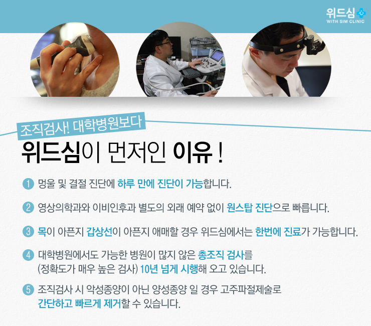 저희 병원에서는 아까 이야기한 갑상선 혈액 검사뿐만 아니라 초음파도 함께 추천하고 있었습니다.갑상선 초음파는 MRI나 CT와 달리 방사선을 사용하는 검사가 아니기 때문에 고령자나 임산부 등 해당 파장에 취약해 문제가 될 수 있는 분들에게도 실시할 수 있다는 장점이 있었습니다.다만 해당 초음파는 갑상선 종양 여부만 알아볼 수 있는 검사 방식이기 때문에 보다 정확한 결과를 얻고 싶다면 혈액을 채취하는 검사를 추가로 받아야 한다고 했습니다.또한 저희 병원에서는 보다 정확한 결과를 파악할 수 있도록 여성 외과 전문의가 상주하고 있었습니다.원장님께서 검사부터 치료까지 모두 직접 시행하고 있는 의료기관이니 문제가 의심되면 편하게 내원해 보시기 바랍니다.