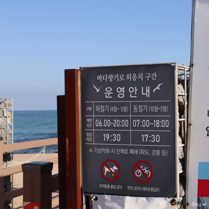 1. 외옹치 바다향기로 강원 속초시 대포동 656-14 백사장이 아닌 갑판을 따라 바다를 바라보며 산책하기 좋은 곳.겨울철 10월~3월 : 오전 7시 ~ 오후 6시 개방