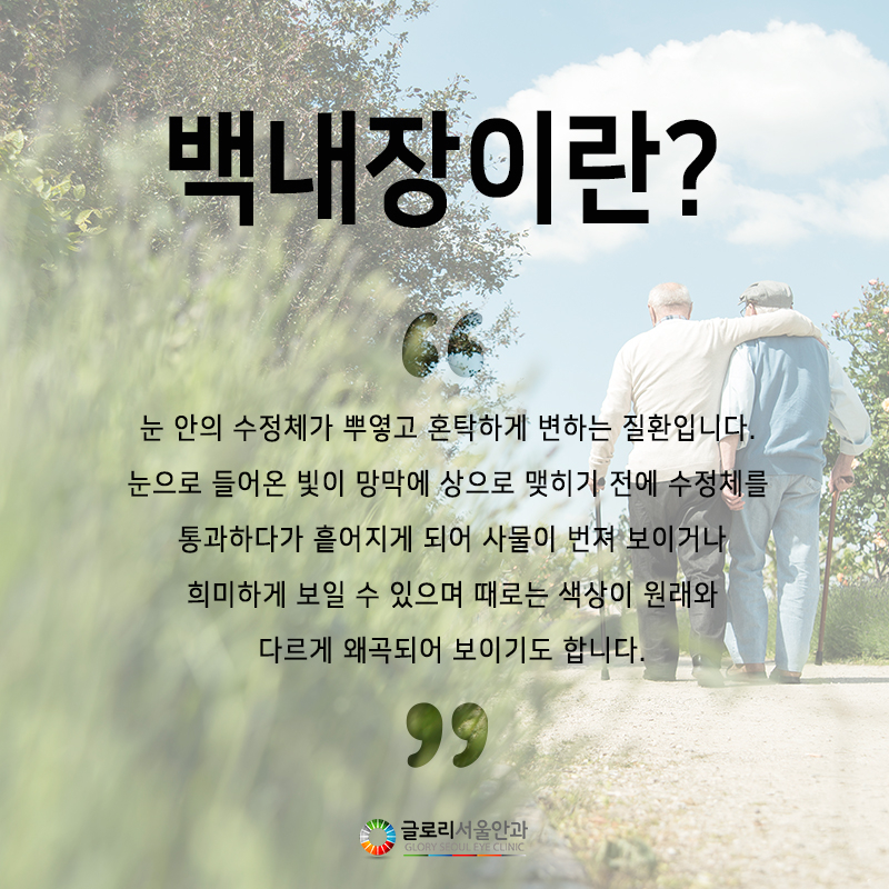 백내장은 눈 속에 있는 수정체가 어떤 원인에 의해 희미해지는 질환을 말합니다.사람의 눈은 카메라와 아주 유사한 구조를 가지고 있지만 수정체는 카메라 렌즈에 해당하는 조직이라고 할 수 있습니다.눈에 들어온 빛을 통해 망막으로 전달되어 사물에 초점을 맞추는 역할을 하는데 카메라 렌즈에 이물질이 끼면 사진이 흐릿해지듯이 수정체도 투명성을 잃고 혼탁해지면 빛이 제대로 통과하지 못하고 흩어지기 때문에 앞을 보는 데 문제가 생길 수밖에 없었습니다.수정체가 혼탁해지는 원인은 매우 다양하다고 생각할 수 있으나 유전적인 원인이나 임신 초기의 풍진감염 등에 의하여 선천적으로 발생하는 경우도 있으나 노화나 눈의 외상, 당뇨나 고혈압등의 전신 질환, 안중염증, 독소등에 의하여 발생하는 후천성 백내장이 대부분을 차지하고 있었습니다.