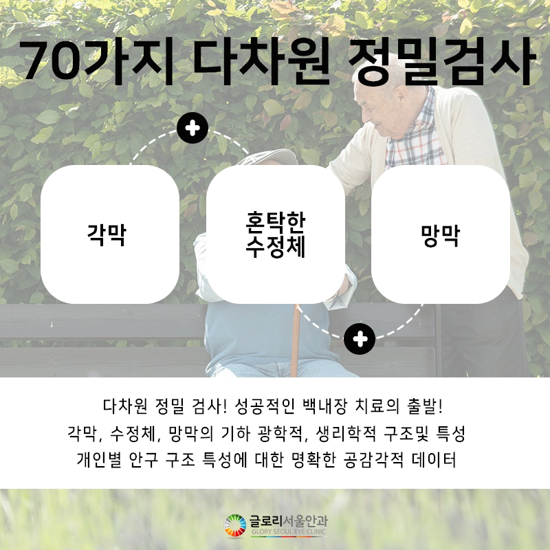 본 병원은 백내장 개선에 성공시키기 위해 수술 전 7단계의 70종류 이상의 다차원 정밀 검사를 실시하고 있었습니다.기본적인 시력검사는 물론 각막, 수정체, 망막의 기하광학적 및 생리학적 구조와 특성을 확인하고 시력에 영향을 줄 수 있는 기저질환 여부까지 세밀하게 진단하고 있습니다.정밀한 교차진단을 통하여 수술가능 여부를 결정하고 개인별 안구구조 특성에 대한 명확한 공감각적 데이터를 바탕으로 일대일 수술방법을 찾고 있습니다.전술한 바와 같이 백내장은 실명질환에 속해 있으므로 증상이 나타났을 때에는 신속하게 안과에서 진찰을 받아 보는 것이 중요하며, 눈에 어떠한 이상이 없더라도 40대부터는 연 1회 정기적인 안과 검진을 통해 눈의 건강상태를 체크해 보는 것이 좋습니다.