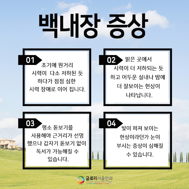 백내장은 수정체의 혼탁으로 인해 시력이 저하되는 질환이므로 시력장애 이외에 특별한 통증은 수반되지 않지만 개인차에 의해 수개월 이내에 급속히 진행되는 경우도 있으며 수년에 걸쳐 서서히 진행되는 경우도 있었습니다.백내장의 증상도 수정체의 혼탁 위치와 범위와 정도에 따라 다르다고 할 수 있습니다.초기의 수정체 주변부에만 혼탁이 발생하는 경우는, 뚜렷한 시력 감퇴를 느끼지 못하는 경우가 많아, 노안이나 눈의 피로라고만 생각하는 분이 많은데, 시간이 지남에 따라 거리에 관계없이 시력이 저하되는 것을 느낄 수 있었습니다.수정체 중앙부에 혼탁이 생긴 경우는 눈동자가 수축하는 낮 시간이나 밝은 곳에서 시력이 심하게 나빠져서 오히려 어두운 곳에 있을 때나 밤에 시력이 좋아지는 주맹증상이 나타날 수 있고 사물을 볼 때 여러 개가 겹쳐 보이는 복시증상도 동반될 수 있었습니다.이 밖에도 자동차 전조등과 태양 등 밝은 빛을 바라볼 때 빛이 퍼져 눈부시거나 안개가 낀 것처럼 시야가 뿌옇다면 백내장을 의심해 보는 것이 좋습니다.