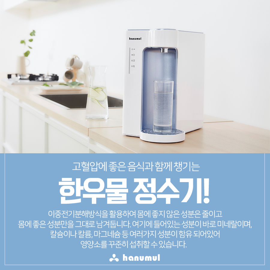 이렇게 고혈압에 효과적인 음식 종류에 대해서 알아봤는데요 고혈압을 관리하고 예방하기 위해서는 음식을 준비하는 것도 중요하지만 그와 함께 건강에 좋은 물도 준비하는 것이 좋을 것 같습니다특히 최근에는 정수기로 물을 마시기 쉽기 때문에 수분을 섭취하는 것이 편리해졌습니다.정수기를 사용하는 가구가 많아지면서 정수기를 선택하는 기준이 작아지는 분들도 많아졌습니다.이런 분들을 위해서 한우물 정수기를 추천드릴 수 있는데요, 특히 한우물 정수기는 이중 전기 분해 방식을 사용하기 때문에 미네랄 성분이 풍부하고 고혈압에도 효과적인 물을 섭취할 수 있다고 합니다.따라서 고혈압을 예방하고 관리하기 위해서는 다양한 음식을 섭취하는 식습관과 더불어 한우물 정수기를 사용하는 것도 한 방법입니다.
