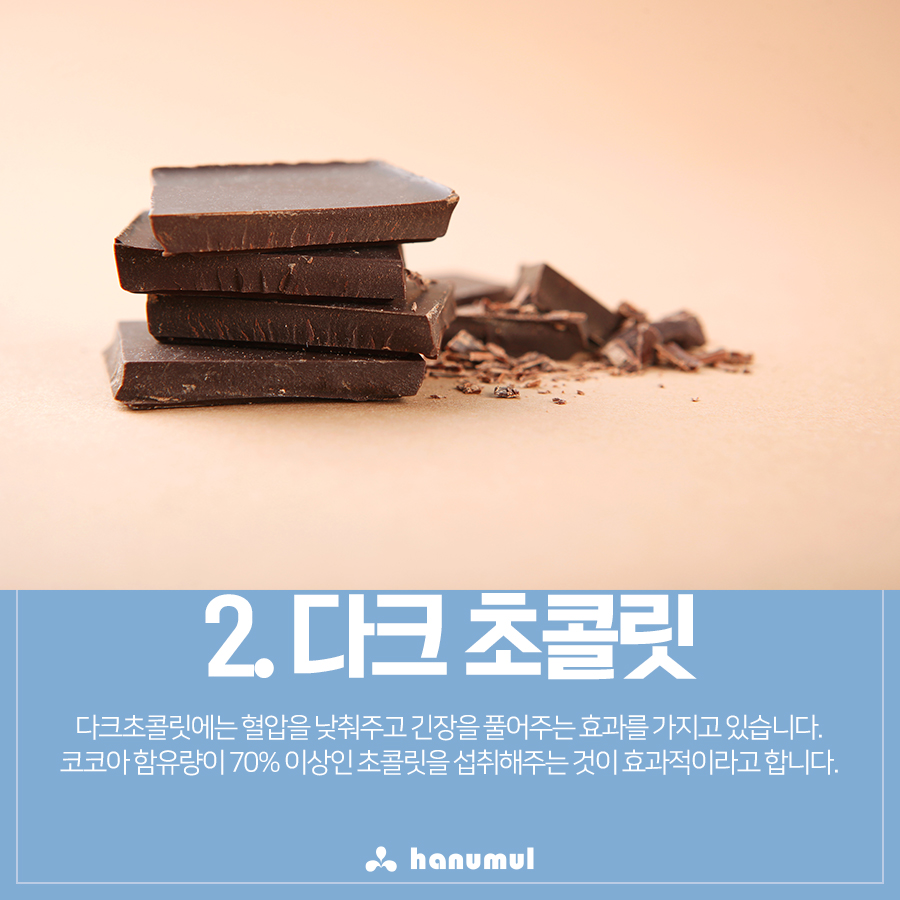 두 번째로는 고혈압에 좋은 음식으로는 다크초콜릿이 있는데 놀라거나 화가 난 상태에서는 초콜릿을 먹으면 진정될 것 같아서 초콜릿을 섭취하는 분들이 있습니다.실제로 다크초콜릿은 혈압을 낮추는 효과가 있기 때문에 긴장 상태를 완화시키는 효과도 볼 수 있다는 연구 결과도 있다며 특히 코코아가 다량 함유된 초콜릿은 고혈압이나 고혈압 전단계 환자의 혈압을 낮추는 데 효과적이므로 잘 먹어주는 것도 좋은 방법이라고 말했다.그런데 많이 알려진 것처럼 초콜릿은 한꺼번에 많은 양을 섭취하거나 자주 섭취하는 경우에는 문제가 발생할 수 있기 때문에 적절하게 조절해서 섭취하는 것이 중요하다고 하네요.또한 최소 70% 이상의 코코아를 함유한 고품질의 초콜릿을 섭취하는 것이 효과적이라고 하며, 하루에 정사각형 또는 1온스 크기의 조각을 섭취하는 것이 적절하다고 하니 참고 바랍니다.