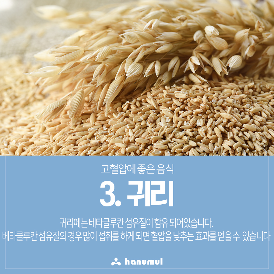 세 번째로 알아보기에는 귀리가 있는데 귀리에는 베타글루칸이라는 섬유질이 포함되어 있다고 합니다.이 섬유질은 혈중 콜레스테롤 수치를 낮춰주기 때문에 고혈압에 효과적인 음식으로 알려져 있습니다.또한 일부 연구에 의해 혈압을 낮추는 데도 효과가 있음을 증명했다고 해요.특히 베타글루칸이라는 섬유질의 경우 많이 섭취하면 수축기의 혈압과 이완기의 혈압을 모두 낮출 수 있기 때문에 고혈압으로 되어 있으면 더욱 효과적인 음식이 됩니다.이러한 섬유질을 포함하고 있는 음식으로 보리도 있다고 하니 참고해서 섭취하면 좋다고 생각해요.