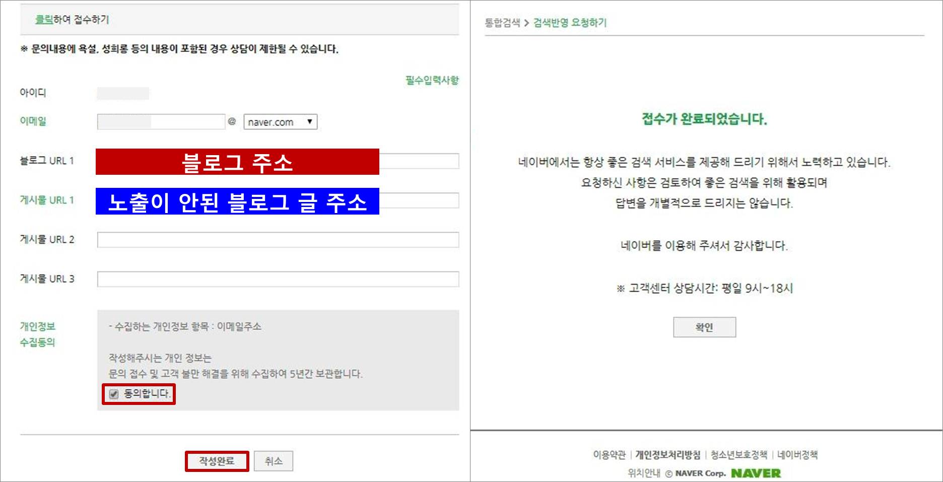 [검색반영요청] : 통합검색고객센터 네이버 서비스 이용에 필요한 고객센터 도움말을 확인해주세요. 검색과 스마트봇으로 보다 쉽고 빠르게 질문을 해결할 수 있습니다.help.naver.com<검색결과 반영 요청 가능한 콘텐츠> 네이버 블로그 네이버 카페 외부블로그(다음, 티스토리 등) 웹검색영상, 이미지방송, 웹오리지널, 공연(직접등록)축제, 이벤트콘텐츠(직접등록)기타콘텐츠오른쪽 내용에 해당하지 않을 경우 신청 가능합니다.위 링크를 클릭하여 해당 내용을 작성하신 후 문의를 하시면 관련하여 반영될 수 있습니다.두 번째 방법위 홈페이지에 통합검색 스마트봇을 통한 검색 반영 요청으로도 신청 가능합니다. 톡톡에서 선택하는 방법만 조금 다르고 신청 포맷은 동일합니다. 편안한 것을 이용하세요.통합검색 스마트봇1) 검색 반영 요청톡톡 서비스2) 블로그 게시물 검색결과 반영요청3) 뷰 검색4) 검색 반영 요청 클릭이상 루앙데이였습니다. 누락으로 고생하시는 분들께 도움이 되었으면 좋겠습니다. 감사합니다。<관련글> [정보] 꾸미기 설정에서 블로그 스킨 배경을 바꾸는 방법(PC버전) [블로그 팁]네이버가 싫어하는 이미지 5가지(이걸 모르면 패널티가 생깁니다) [정보] 블로그 글자수 세는 법+상위 노출을 위한 키워드 분석방법(ft.엠서포터)이상 루앙데이였습니다. 누락으로 고생하시는 분들께 도움이 되었으면 좋겠습니다. 감사합니다。<관련글> [정보] 꾸미기 설정에서 블로그 스킨 배경을 바꾸는 방법(PC버전) [블로그 팁]네이버가 싫어하는 이미지 5가지(이걸 모르면 패널티가 생깁니다) [정보] 블로그 글자수 세는 법+상위 노출을 위한 키워드 분석방법(ft.엠서포터)