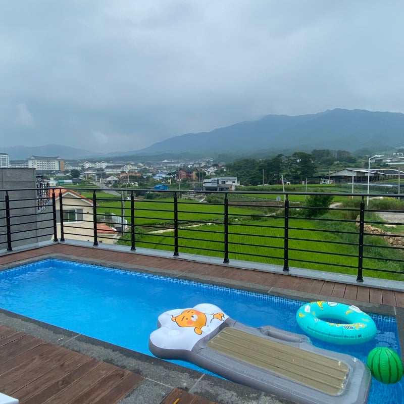 입구에 위치한 주차장에서 5걸음 정도 이동하면 야외 공용 수영장을 사이에 두고 A동~C동까지 갖춘 경주 풀빌라 펜션을 만날 수 있다. 우리는 안쪽에 있는 C동 1층에 머물렀다. 도착하자 기다리던 점주가 객실 안내와 함께 쓰레기 분리수거장 등 친절하게 알려줬다.