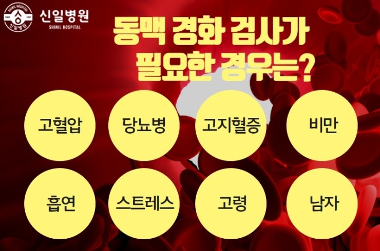 고혈압, 당뇨병, 고지혈증 도가 있으신 분이나 비만이나 흡연하시는 분, 스트레스가 많은 분, 노약자 주로 남성분이라면 동맥경화 검사가 필요합니다.