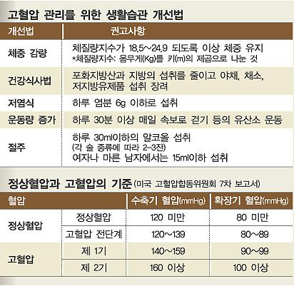 혈액 순환이 좋아짐에 따라 심장이 펌프를 약하게 해도 혈액 순환이 좋아집니다. 그러면 자연스럽게 혈압이 낮아집니다. 운동이 부족한 분은 적어도 30분 이상 조깅을 하는 것을 추천합니다. 익숙해지면 땀이 날 정도로 서서히 운동 시간을 늘려가야 합니다.저녁에 혈압이 떨어지니 저녁 운동을 권장합니다. 비만인 사람이 10kg 감소당 5~20mmHg 혈압을 낮출 수 있다고 하니 체중 감량은 필수입니다.4)건강한 체중 유지와 체중 또는 비만은 고혈압의 위험을 높일 수 있습니다. 아까 말씀드린 운동을 매일 하면서 체중을 적당히 유지시켜 나가는 것이 중요합니다. 과체중인 분들은 한 달에 2kg씩 감량하면서 혈압을 낮춰야 합니다.