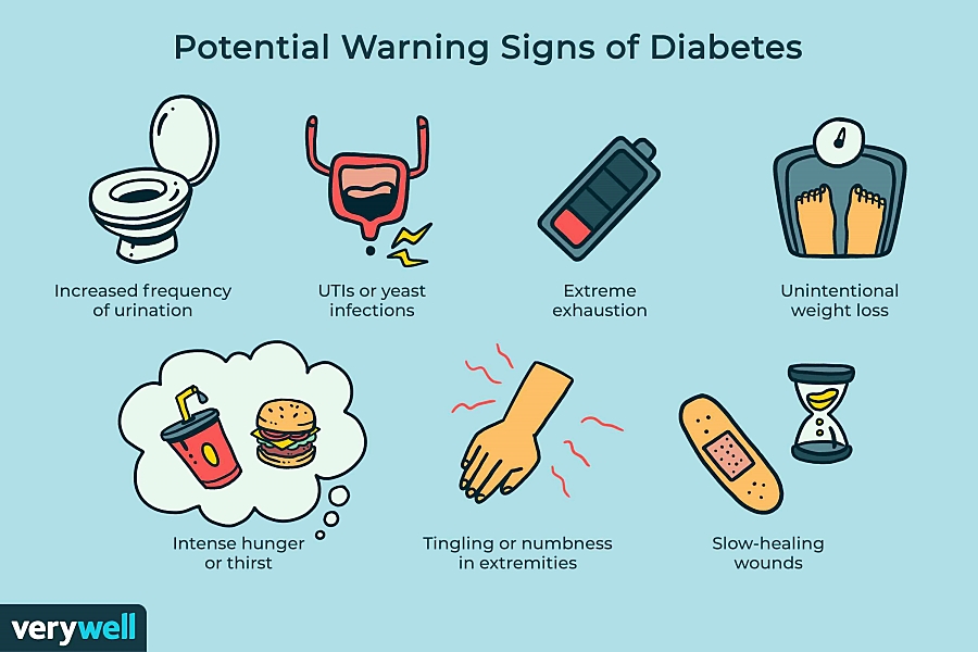 ■ 당뇨병: 약한 고혈당에서는 대부분의 환자가 증상을 느끼지 못하거나 애매해서 당뇨병이라고 생각하기 어렵습니다. 혈당치가 많이 올라가면 갈증이 나서 물을 많이 마시게 되고, 소변량이 늘어나 화장실에 자주 가게 됩니다. 다시 체중이 줄어듭니다. 장기간 고혈당 상태가 유지되면 신체에 여러 가지 합병증이 발생하는데, 대표적인 것이 망막병증(실명될 수 있음), 신기능장애(신기능저하로 심한 경우 투석 필요), 신경병증(저림, 통증), 심혈관계 질환의 위험이 높아집니다.