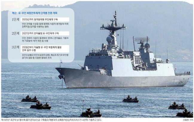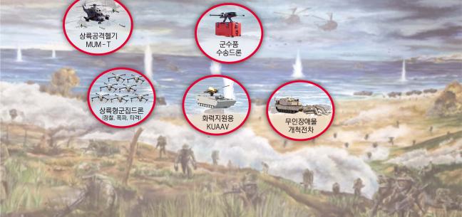해군, 2028년까지 3단계 나눠 유·무인 복합전투시스템 전환계획, 무인수상정·잠수정·항공기 도입 추진…최근 실물개발·시연도 미래 해병대 전장 ‘지능형 입체고속 신속결정작전’으로 함축상륙작전도 장애물 개척로봇·공격드론 등 무인전력 활약 전망