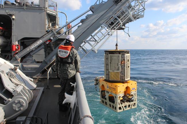 바다에 투입되는 수중무인탐사기(ROV). 수중 물체의 위치를 탐색하고 상태를 확인하는 데 사용하는 이 장비는 해군이 현재 활용 중인 무인전력 중 하나다. 해군 제공