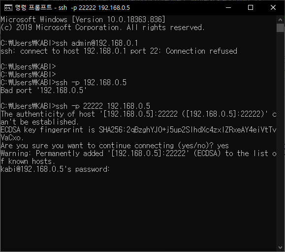 ssh192.168.0.5-p 옵션을 하지 않으면 기본 22번 포트에 연결 ssh-p222192.168.0.5
