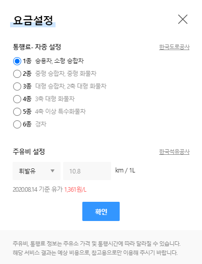 유류비 계산기를 이용한 예상 유류비 값의 예