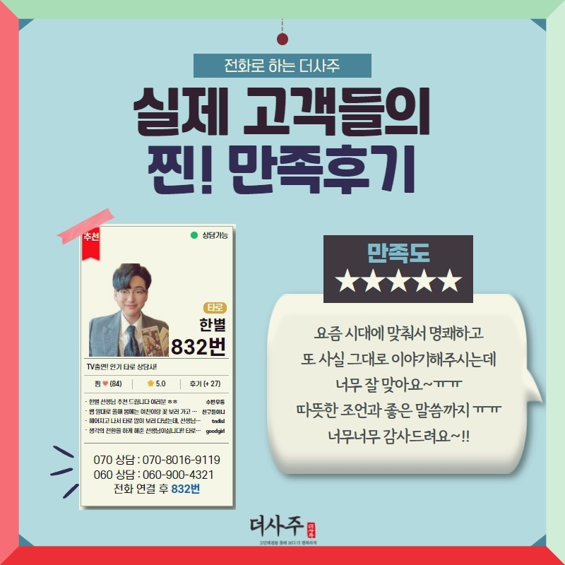 더사주의 한별 씨와 함께라면 타로 상담을 통해 제 고민을 해결할 수 있어요! 리뷰가 보장된 곳의 더사주로 고민을 해결한 고객님의 리뷰를 확인하고 상담도 받아보세요.:>