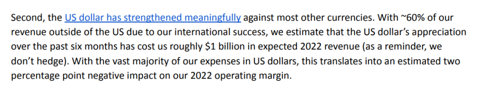 여기에 현재 미국 달러가 보이고 있는 강세는 넷플릭스의 미래 실적에도 영향을 미칩니다. 넷플릭스 구독자의 60%는 미국이 아닌 다른 나라 통화로 결제하기 때문에 환율이 하락하면 이곳에서 환차손을 경험하게 됩니다. 이러한현상이계속되면영업이익률중에2%의부정적인영향을미칠수도있다라고판단하고있죠.