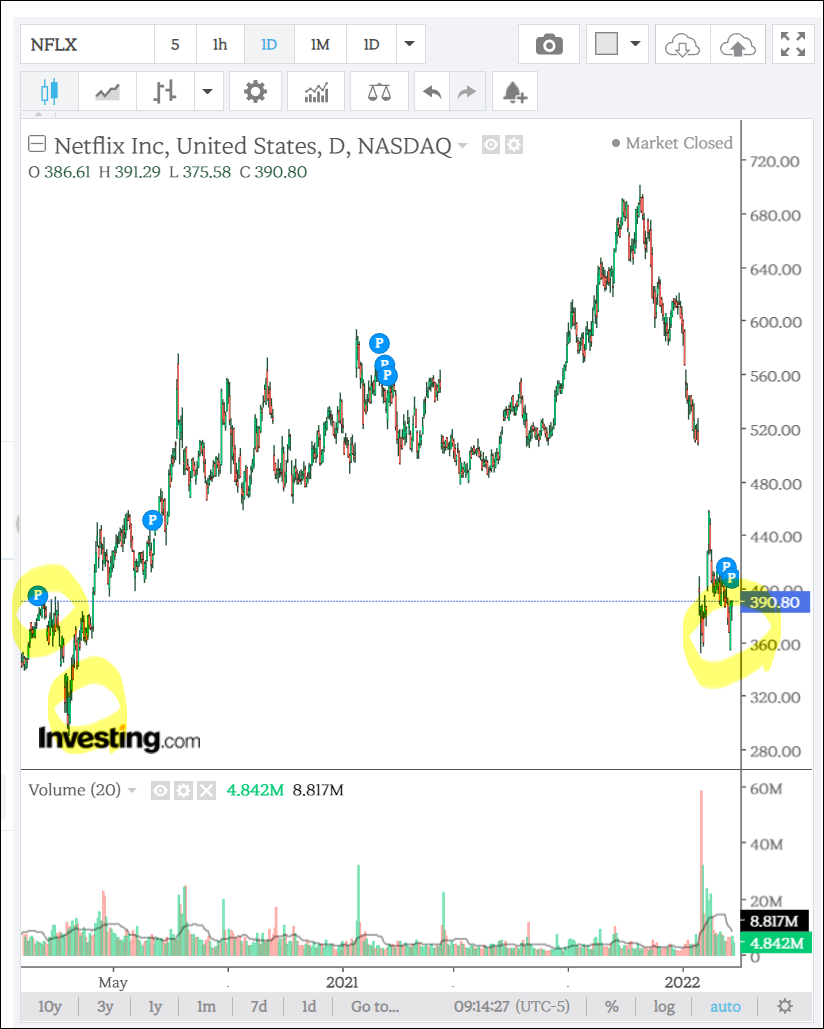 주가는 실적발표 당시 21% 폭락하여 문제점을 기록했습니다. 최고가인 문제점을 찍은 지 불과 몇 개월밖에 지나지 않았는데 이렇게 폭락할 수 있을까 싶을 정도죠. 2020년 3월 코로나 이후 상승했던 상승분을 거의 반납했습니다. 코로나 이전으로 돌아간 넷플릭스의 주가. 과연 정당한 가격일까요?