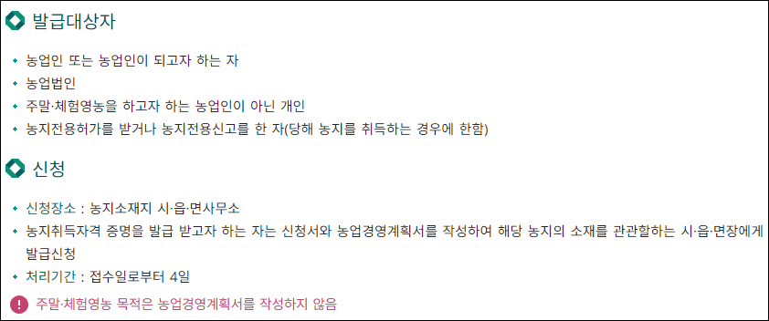 해당 서류 발급 대상자로는 농업인 혹은 농민이 되고자 하는 자, 농업법인 등이 있으며 앞서 설명한 바와 같이 현지 조사를 통해 농지 적격 여부를 확인하게 됩니다. 형질변경 등의 사유로 경작이 어려운 지역의 경우 복구계획서 등 추가 서류가 필요할 수 있습니다.