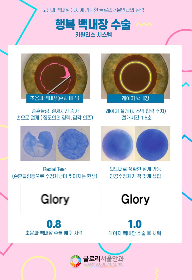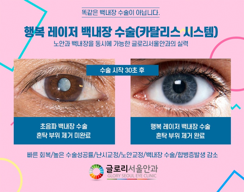 초음파 장치의 경우 기구가 완벽하게 삽입되지 않아 혼탁부위가 남아있기도 하였으나 카탈리스 레이저의 경우 정교한 조사를 통해 깨끗이 제거해주기 때문에 성공률이 높은 결과를 기대할 수 있었습니다. 또한 인공수정체를 삽입하는 과정에서도 수정체의 기울기를 자동 보정하여 입체적인 기울기를 확인하면서 인공수정체를 중앙에 위치시킴으로써 뛰어난 시력을 제공하였습니다.무엇보다 중요한 것은 시력 회복이 현저히 빨라졌고, 입원 없이 당일 귀가는 물론 무리 없이 다음날부터 일상생활을 할 수 있다는 점에서 중장년층의 수술 부담을 덜어주었습니다.