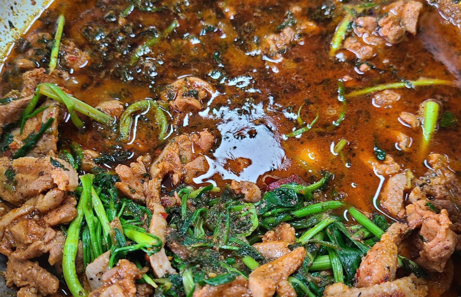 들깨가루를 넣은 양념장에 잘 익은 미나리와 오리고기를 찍어 먹으면 돼!