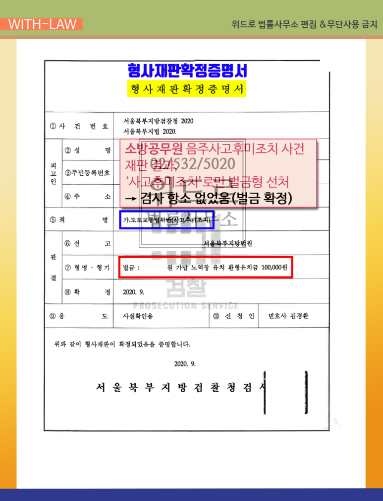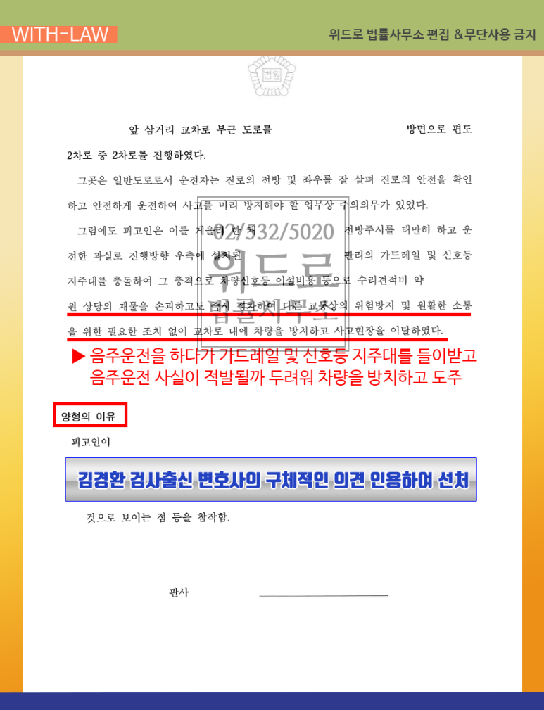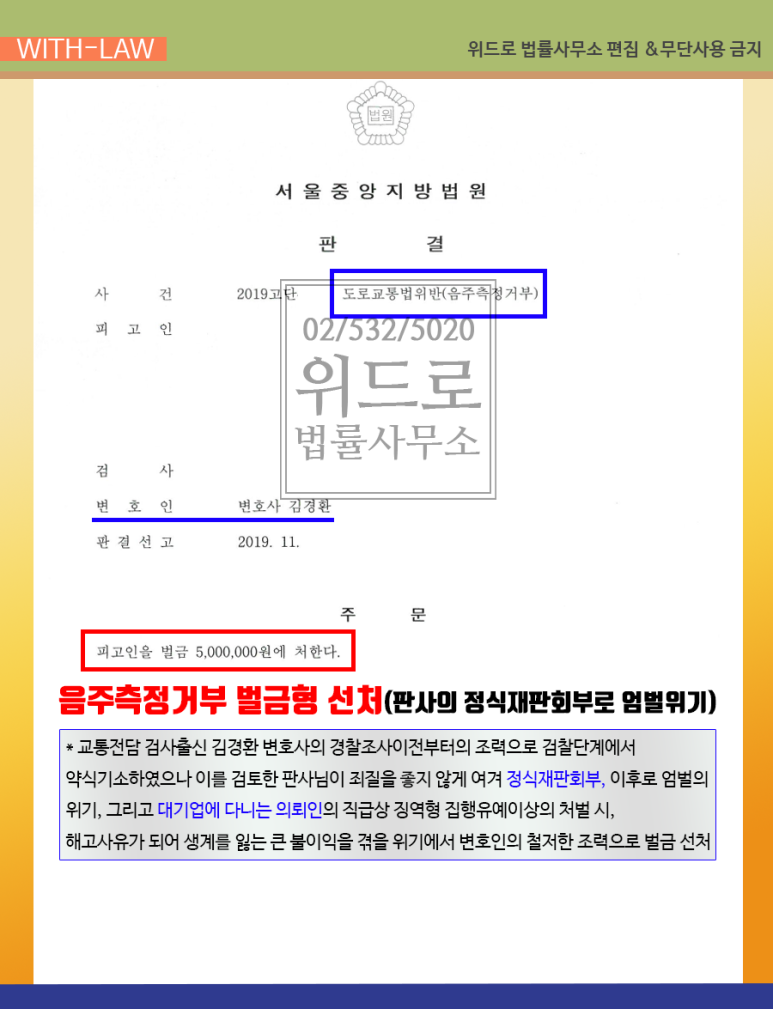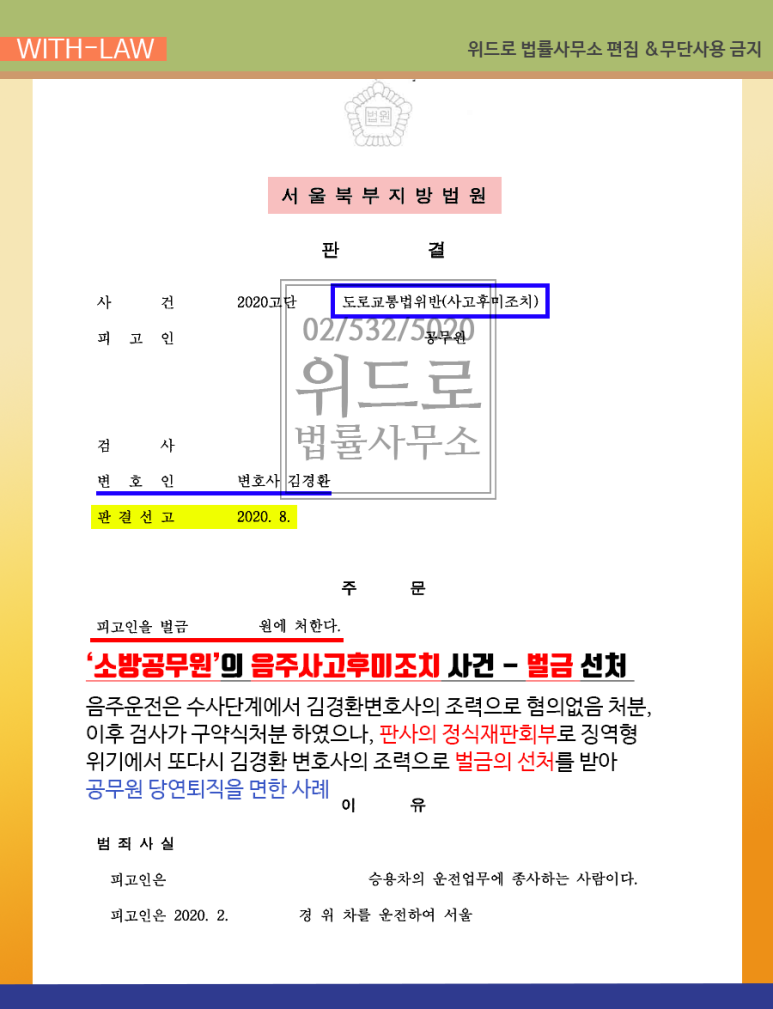 ● 서울북부지법 – 술을 마시고 운전 중 물손사고를 내 ‘공무원’ 신분으로 적발, 만약 공무원이 금고형 또는 징역형의 집행유예 이상을 선고받으면 공직에서 ‘당연히 면직’되기 때문에 with-law 대표 법률대리인에게 도움을 요청한 사례. 결과적으로는 징역형 선고 위기로 벌금 선처를 받았고 공무원의 당연퇴직도 면했습니다.(검사 항소 없이 벌금 확정)