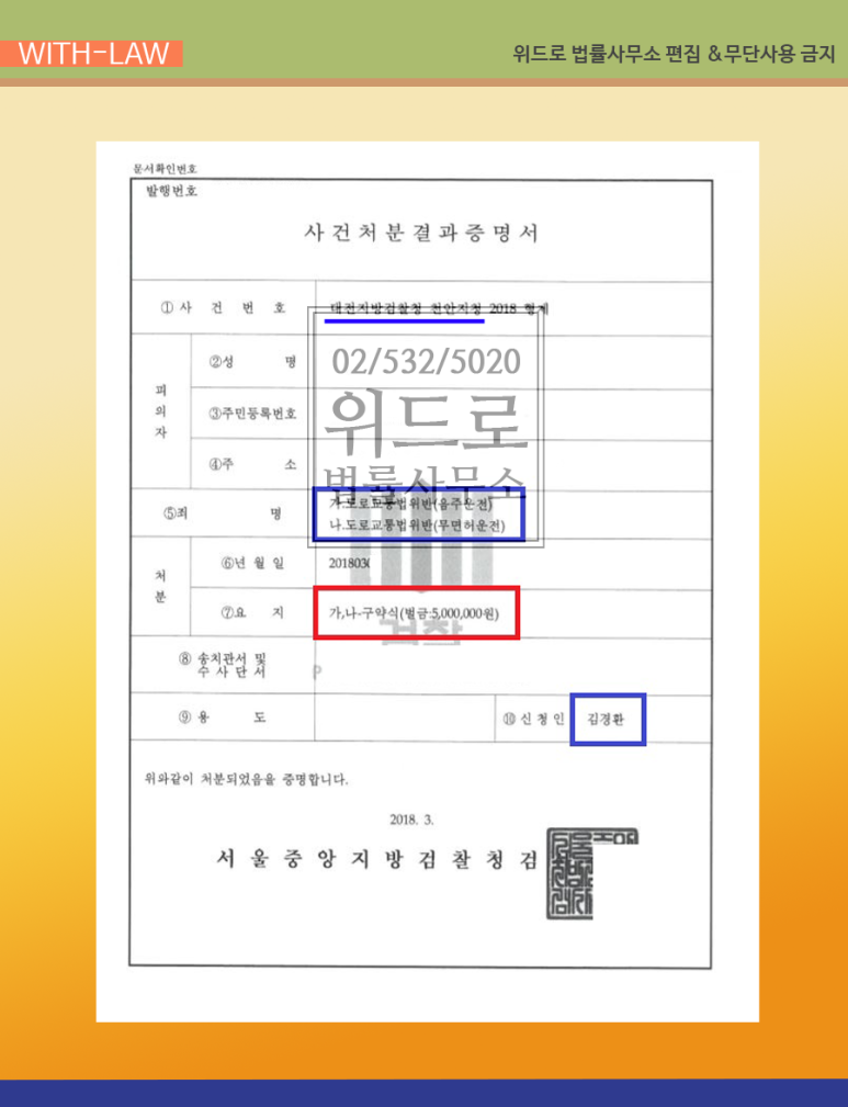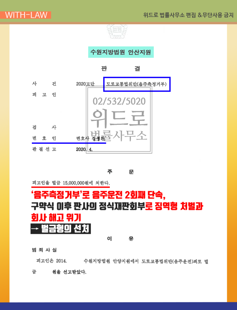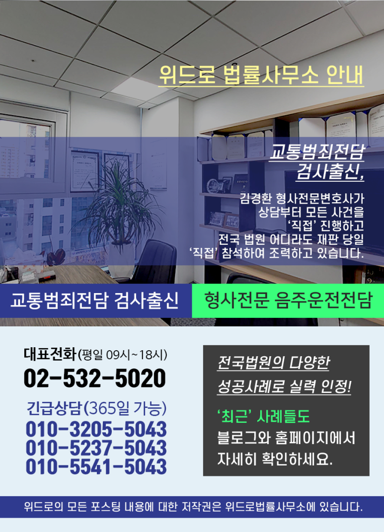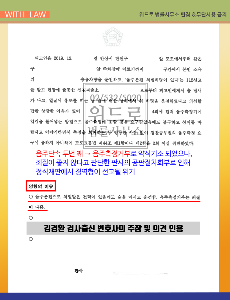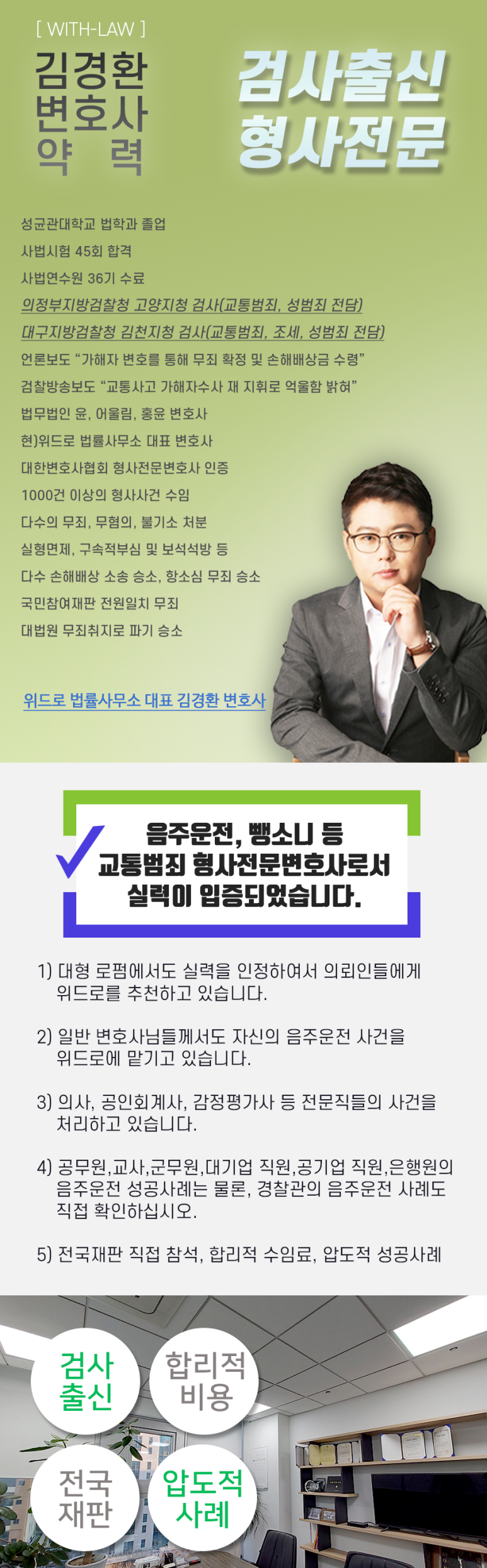 실제 무면허 음주운전 처벌, 그리고 음주측정 거부 처벌 사건으로 정식 재판부가 되면서 엄벌 위기에 놓였지만 검사 출신 경력의 김경환 대표 법률 조력가를 선임해 도움을 받아 가중처벌을 면한 판례이니 참고하시기 바랍니다.