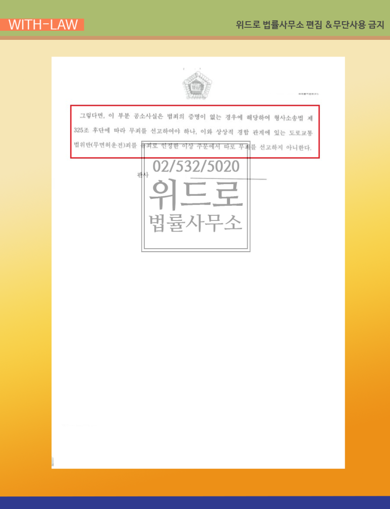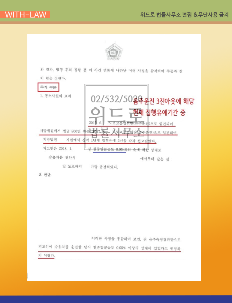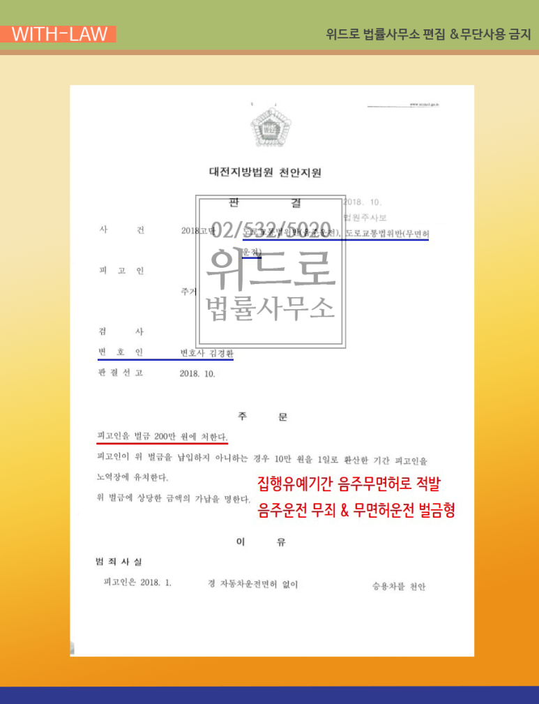 그런 점에서 이 집유기간 중 상습재범 사건은 일차적으로 위즐로 대표변호인이 진행을 도와 검찰의 약식기소가 있었고 공판절차 회부 후에도 철저한 도움을 받아 법정에서 음주운전 죄는 무죄를, 무면허의 경우에는 벌금이라는 매우 유리한 선처를 받아 실형을 면하였으니 참고하시기 바랍니다.