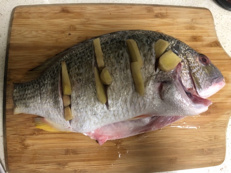 자, 생선 칼집 위의 사진처럼 꺼내서 얇게 썬 생강을 꽂아주세요. 나중에 향이 너무 좋았어요생각보다 훨씬 좋아 🙂