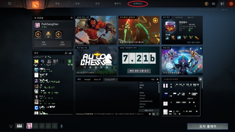 4. 도타2 메뉴 창에서 오른쪽 상단의 아케이드를 클릭합니다.도타체스는 도타2의 아케이드 게임입니다.