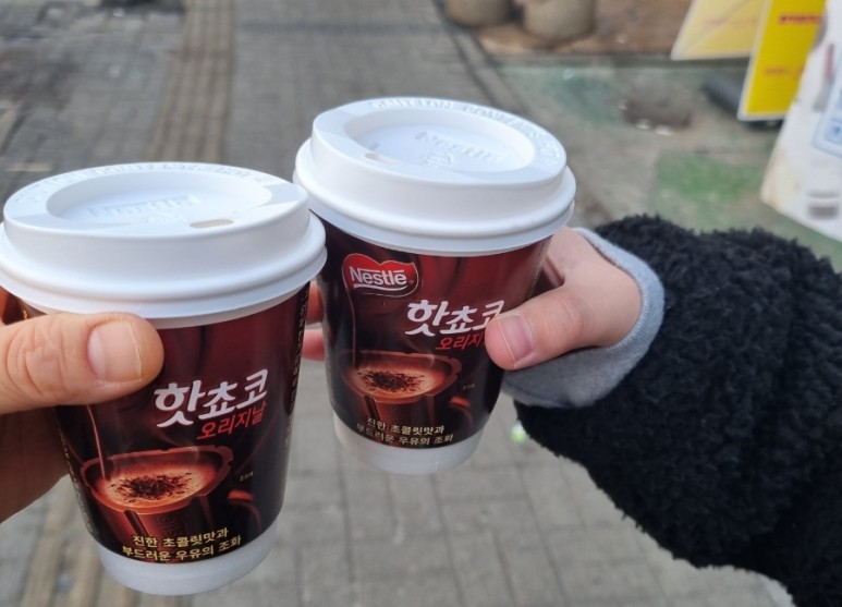 이 날 굉장히 추웠는데 일찍 도착해서 둘이서 편의점에 가서 핫초코 한잔 마시고 시험장 건물 앞에서 마시고 들어왔습니다.