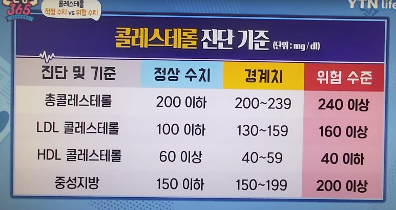 혈액검사 결과 총 콜레스테롤 수치가 200mg/dL 이하면 정상 상태이지만 240mg/dL 이상이면 위험 수준으로 판단해야 합니다.또한 나쁜 콜레스테롤 수치가 130mg/dL 이상이면 경계영역으로 관리가 필요한데, 이때는 식이요법 등으로 고지혈증이 좋은 음식을 섭취하거나 운동요법 등을 해야 합니다.식습관 개선 등의 식이요법은 지질이상증을 관리할 때 기본적으로 생각해야 하지만 필요한 영양상태를 유지하고 혈액 속 지질함량을 낮추기 위해서는 지속적인 노력이 필요합니다.