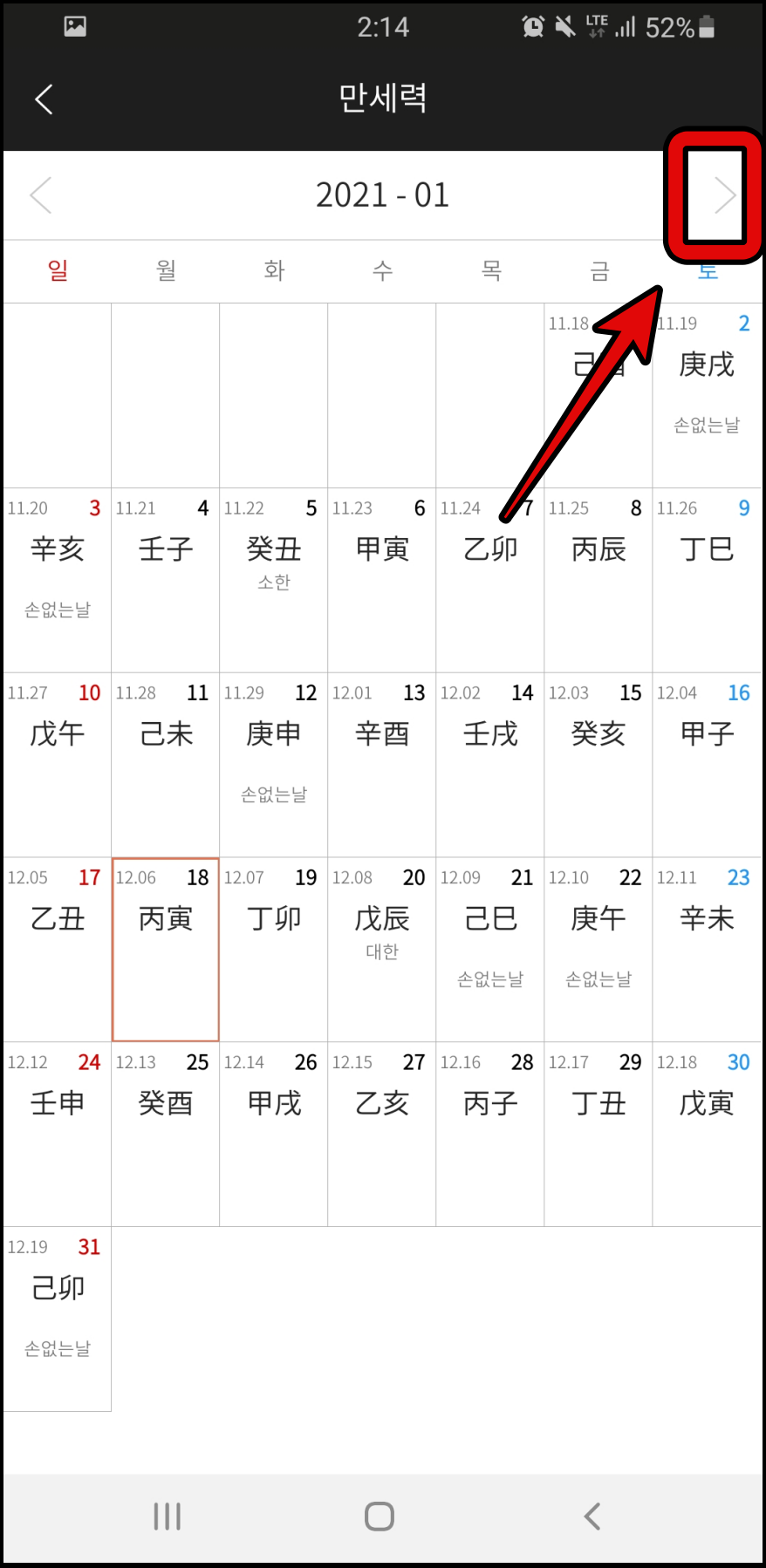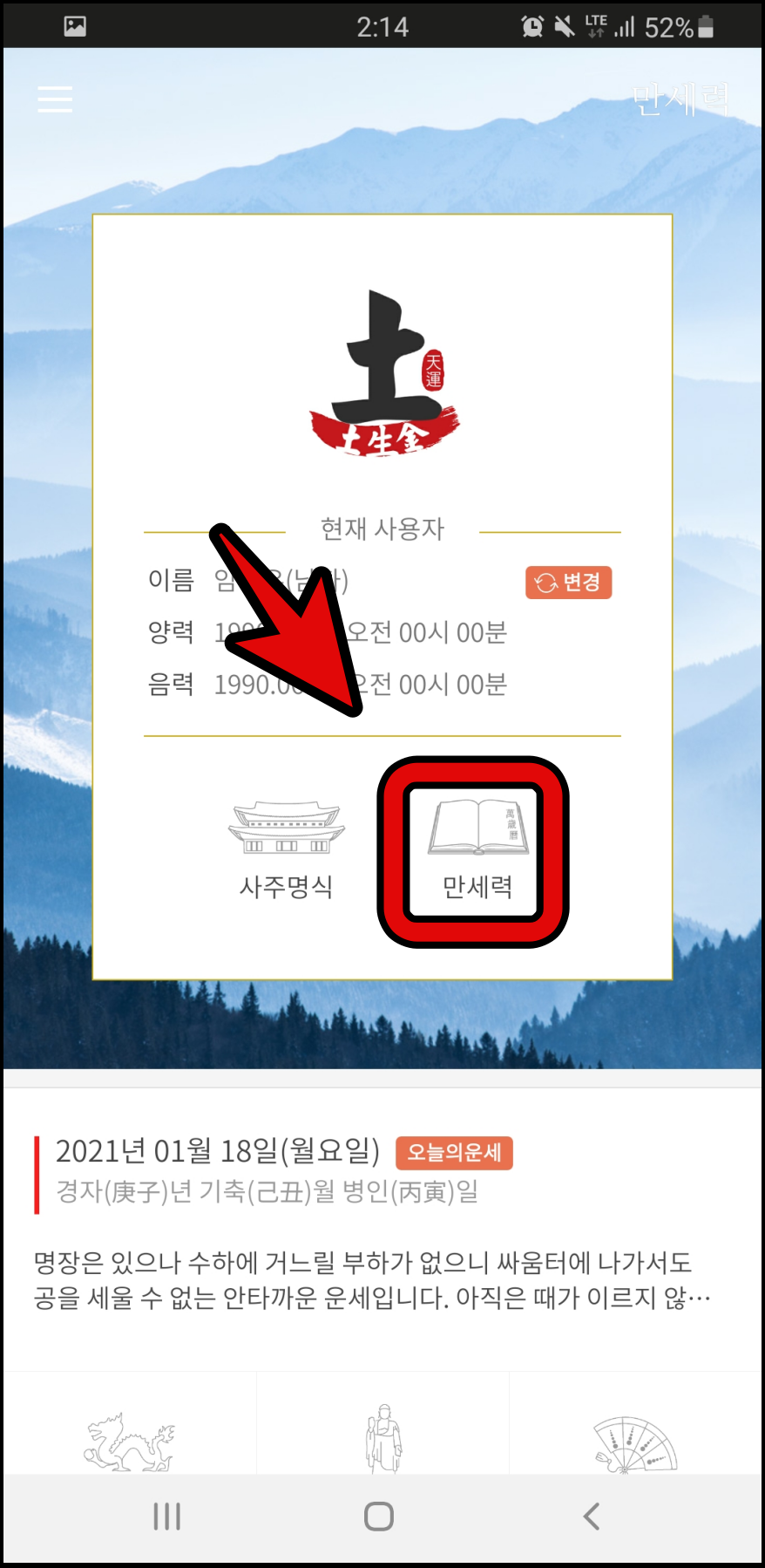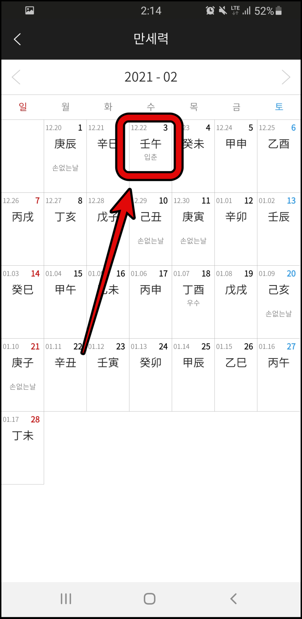 5. 표시된 메인 화면에서 중간의 만세력 버튼을 누릅니다. 6. 만세력 화면에서 오른쪽 상단의 오른쪽 또는 왼쪽 버튼을 누르고 싶은 달을 선택합니다. (올해 입춘은 2월 3일이므로 2월을 선택합니다.)