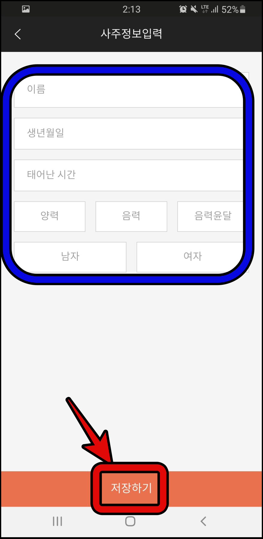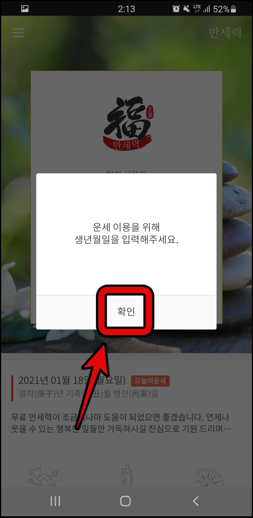 3. 표시된 운세 이용을 위해 생년월일을 입력해주세요. 창에서 확인 버튼을 누릅니다.4. 사주정보 입력이 나오면 파란란에 본인의 정보를 입력한 후 아래에 저장하기 버튼을 누릅니다.