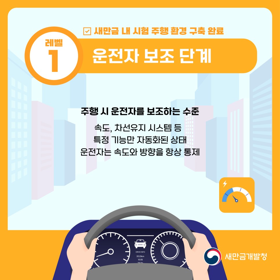 ‘레벨 1’은 드라이버 보조단계로 방향, 속도제어 등의 특정 기능은 자동화되어 있으나 드라이버가 차의 속도와 방향을 항상 컨트롤할 필요가 있습니다.크루즈 컨트롤, 차선 이탈 경보 장치, 긴급 제동 장치 등이 달린 차량을 레벨 1로 분류합니다.