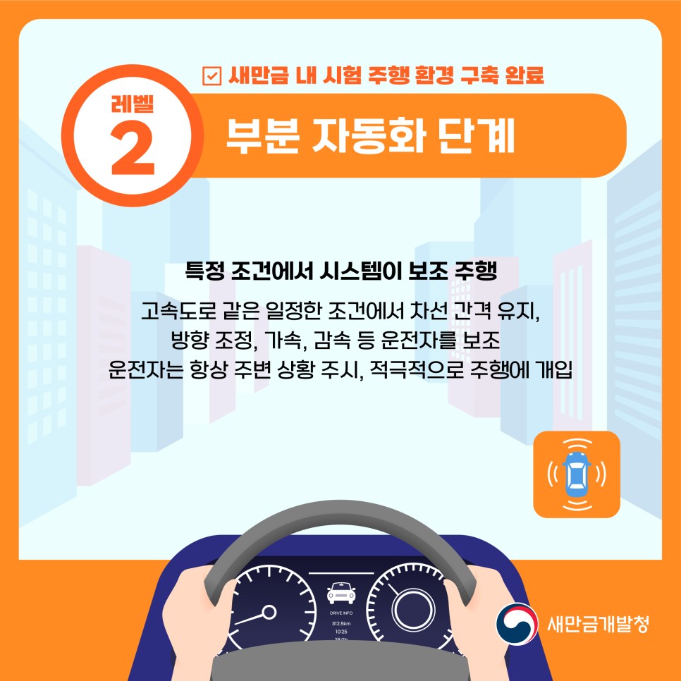 레벨 2는 부분 자동화를 이룬 단계로 고속도로와 같은 정해진 조건에서 차선과 간격 유지는 가능한 단계입니다.레벨 1과 다른 점은 방향 제어 장치와 함께 가속, 감속까지 시스템을 제어할 수 있다는 것입니다.차선을 분리하지 않도록 차 스스로 조향장치를 움직여 앞차와의 간격 등을 고려하여 스스로 속도를 줄이는 것도 가능합니다.그러나 운전자가 항상 주변 상황을 주시하고 적극적으로 주행에 개입해야 합니다.