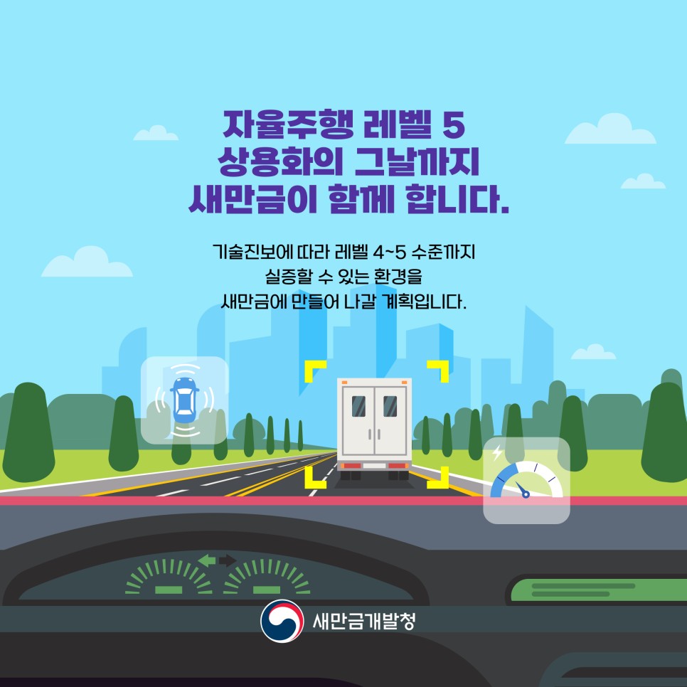 새만금에는 세계적 수준의 자율 주행 테스트베드가 조성되어 있습니다.새만금 자율주행 테스트베드는 새만금 방조제를 활용해 총 21km 구간에 조성되는데 국내에서 가장 긴 규모를 자랑합니다테스트베드에는 차량과 사물간 통신과 지능형 교통시스템 통신 인프라를 구축하여 군집 주행 테스트를 지원할 수 있습니다.