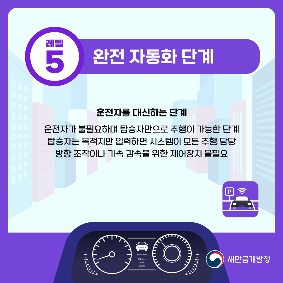 레벨 5는 완전 자동화로 주행 시에는 운전사가 필요 없고, 탑승자만으로 목적지까지 주행이 가능합니다.목적지를 입력하면 자동차 시스템이 모든 조건에서 주행을 담당합니다.레벨 5에 도달하면 드라이버 전용 방향 제어 장치나 가속, 감속을 위한 장치도 필요 없게 됩니다.