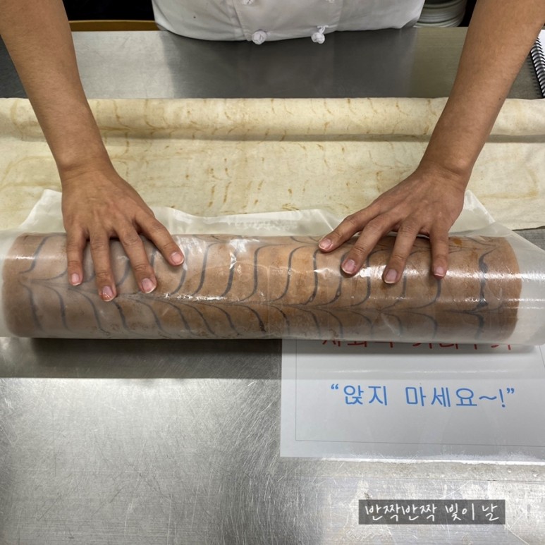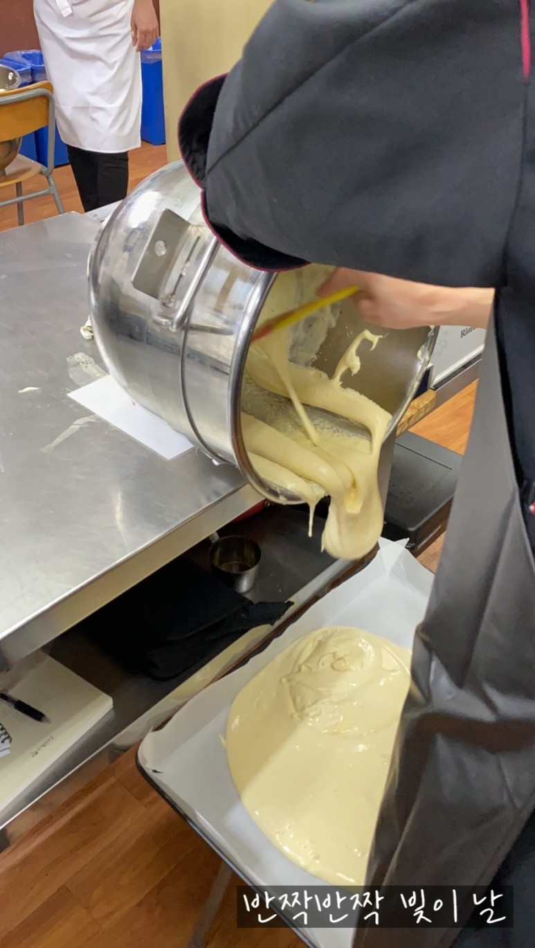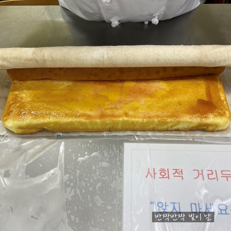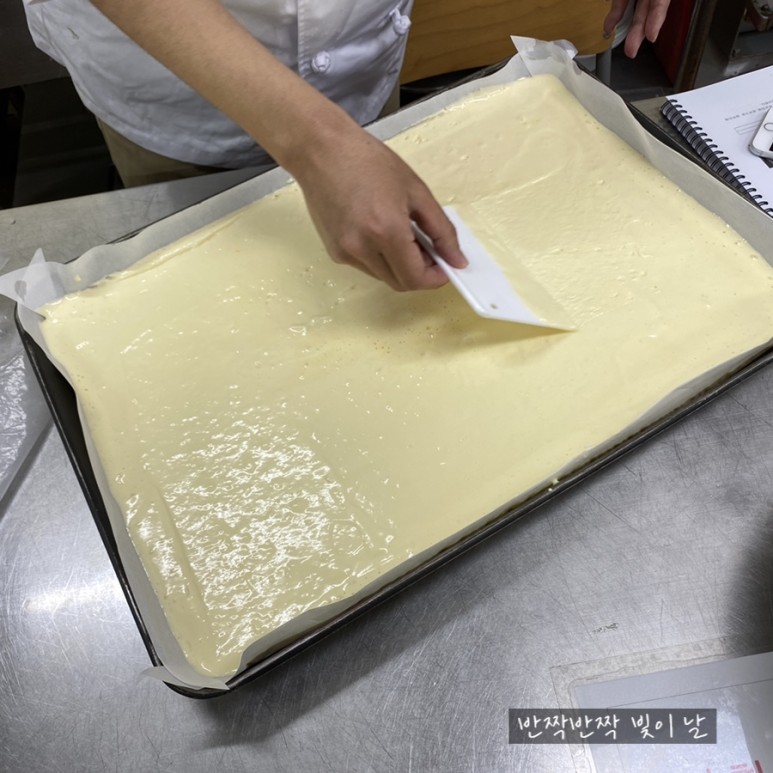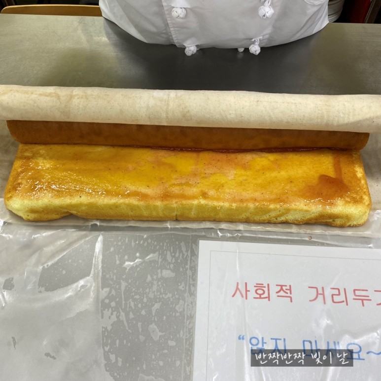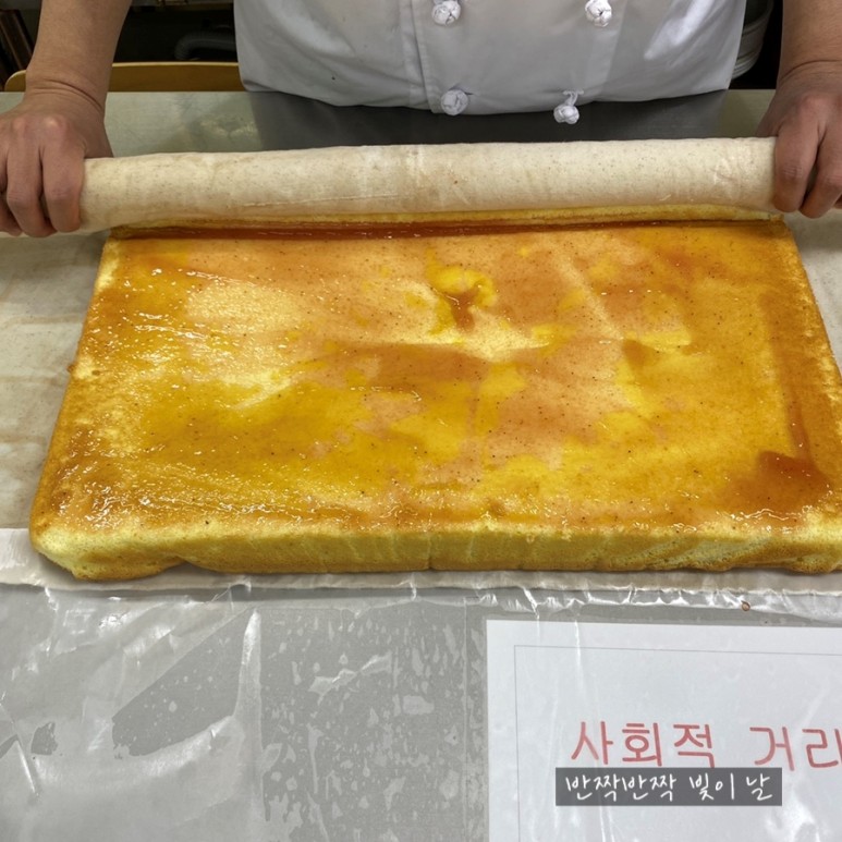 오늘 수업은 2인 1조로 진행되었는데 한 사람이 처음부터 끝까지 진행하고 나머지 사람이 그 과정을 지켜보는 과정에서 진행했어요.여태까지 수업한 제과 수업 중 가장 난이도가 있는 젤리 롤케이크… 비록 구겨본 적은 없지만 롤케익이 얼마나 깨지지 않고 깔끔하게 구겨지느냐가 이 시험의 관건이 될 것 같아요! 터지는 것은 역시 반죽의 비중이 가장 큰 역할을 하는 것 같고, 그 다음은 굽는 정도, 나머지는 말 때 한번에 적당한 힘으로 잘 구겨지는 것이 관건이지만… 이렇게 말해보면 전체 반죽의 비중이 가장 큰 역할을 하는 것 같고, 그 다음엔 말굽거나.. 실수거나.. 하고 말거나… 조가 싶기도 하고 모든게끔히거나 하는 것이 관건이지만.. 이렇게 말해버리고..다음 롤 시간에는 제가 전 과정을 혼자 하게 되는데 그때 더 상세하고 자세한 소감이 나올 거예요!그날을 기대하고 오늘은 이만… 졸졸졸…