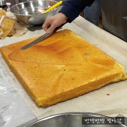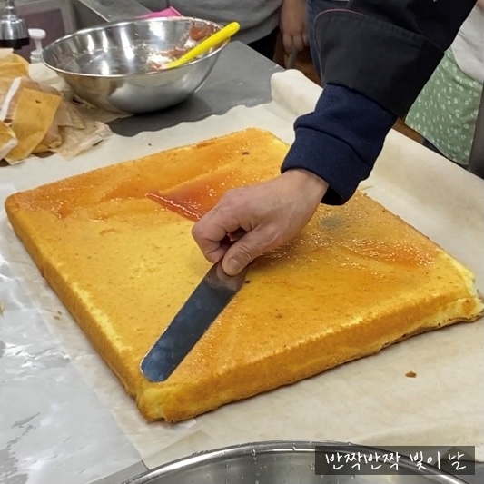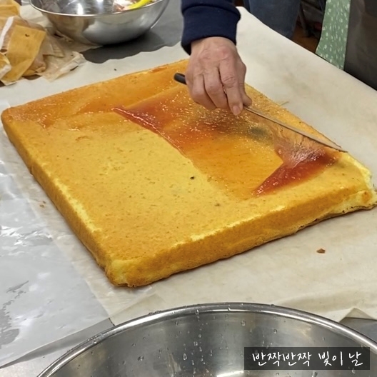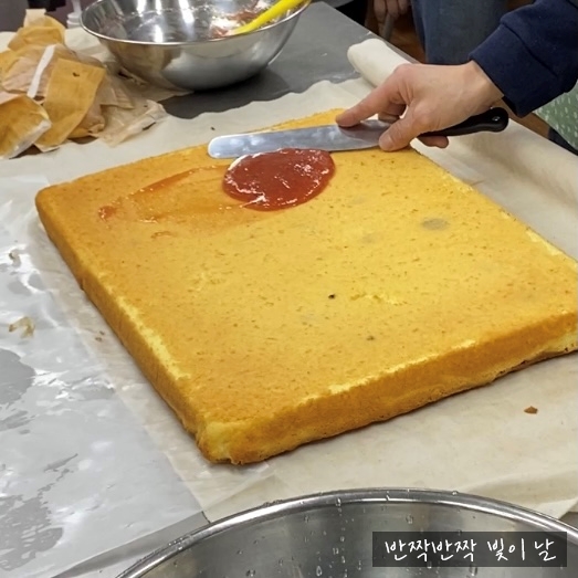 6. 스패츌라를 이용해 시트 밑면에 잼을 골고루 바른다.★안쪽으로 들어가는 부분은 잼을 최대한 적게 바르고 끝부분은 적당히 발라야 안쪽을 누르면서 말 때 잼이 밖으로 튀어나오지 않고 끝부분에 적당한 양의 잼이 있어야 하며 시트가 잘 붙어있다.