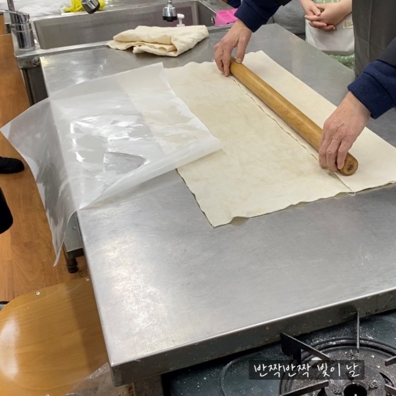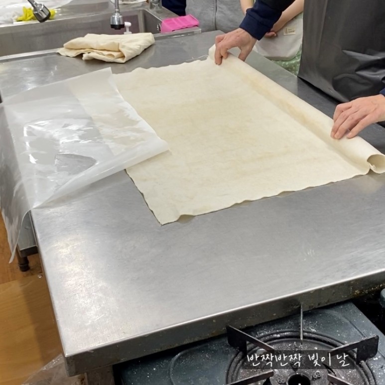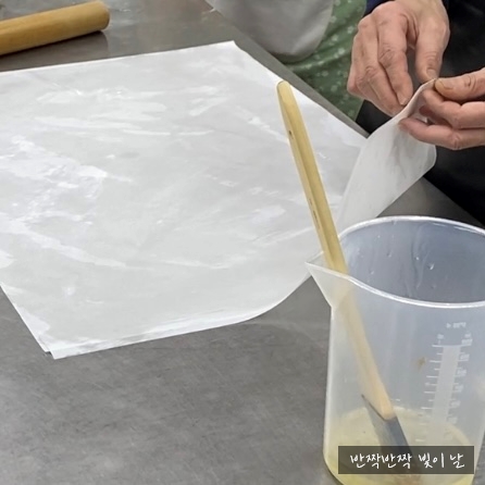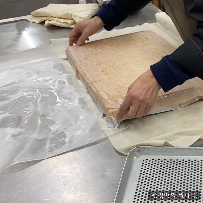 9. 말린 시트를 유린의 유산지에 가볍게 싼 후 바닥쪽으로 들어올려 타공팬의 끝쪽으로 보내고 유린지를 풀어 제출하면 끝!