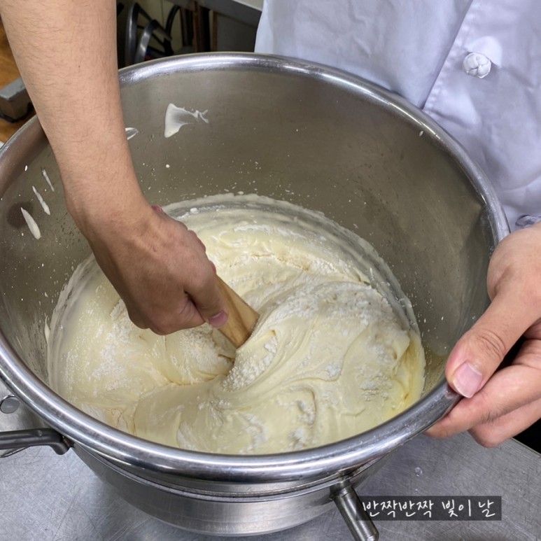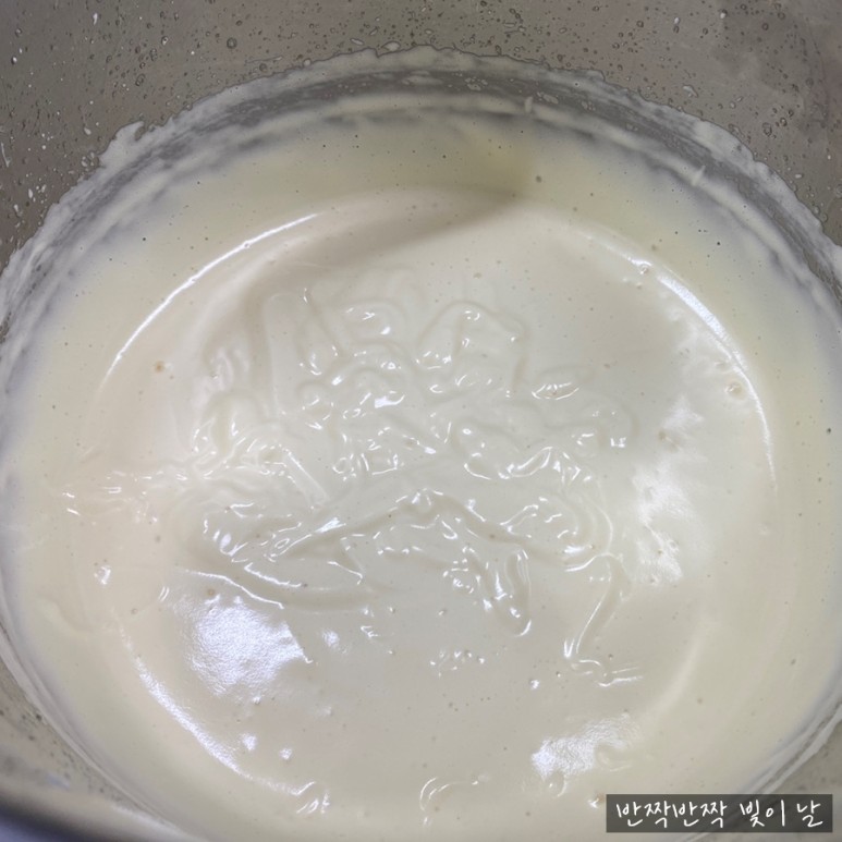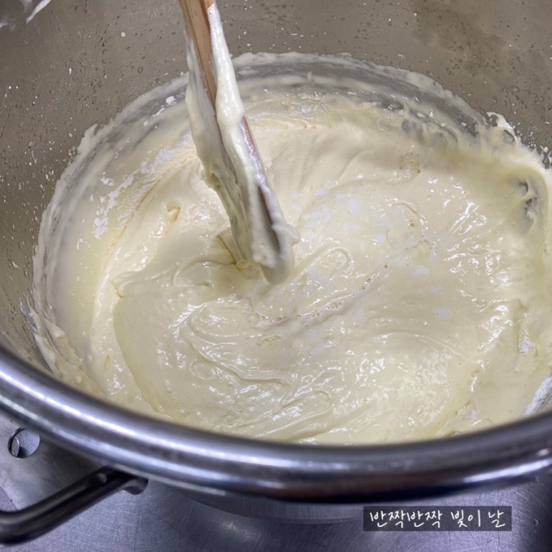 3. 믹싱기를 믹서기에 갈아 고속(3단)으로 5분, 중속(2단)으로 15분을 돌려 거품을 치밀하게 만든다.(색상은 아이보리 정도만 나오면 되고, 원단에 휘퍼자국으로 인한 결무늬가 5초정도 살아있는 상태여야 함.)