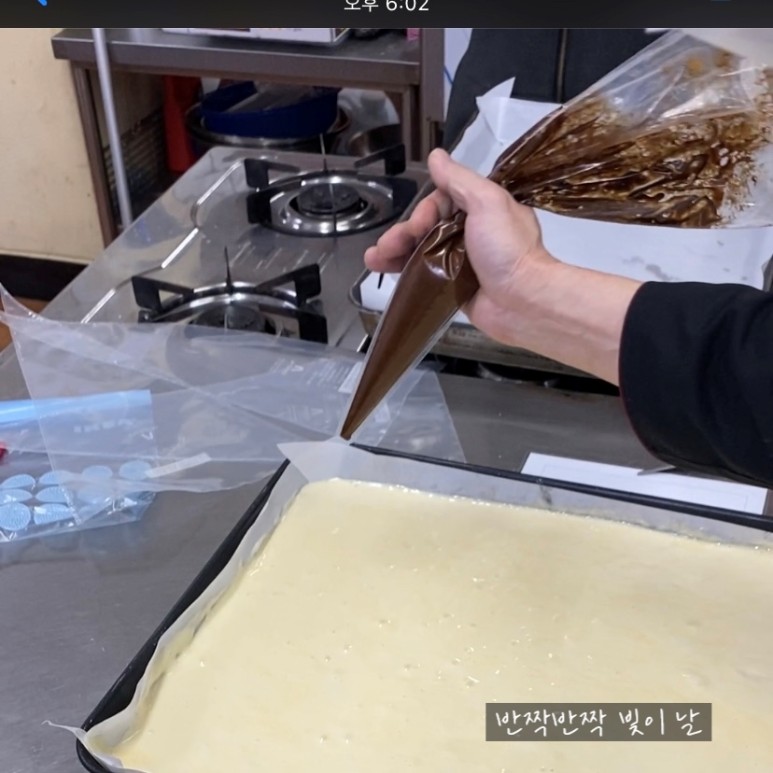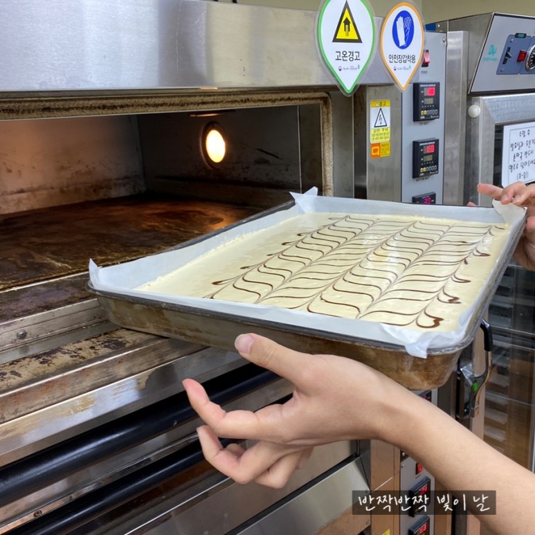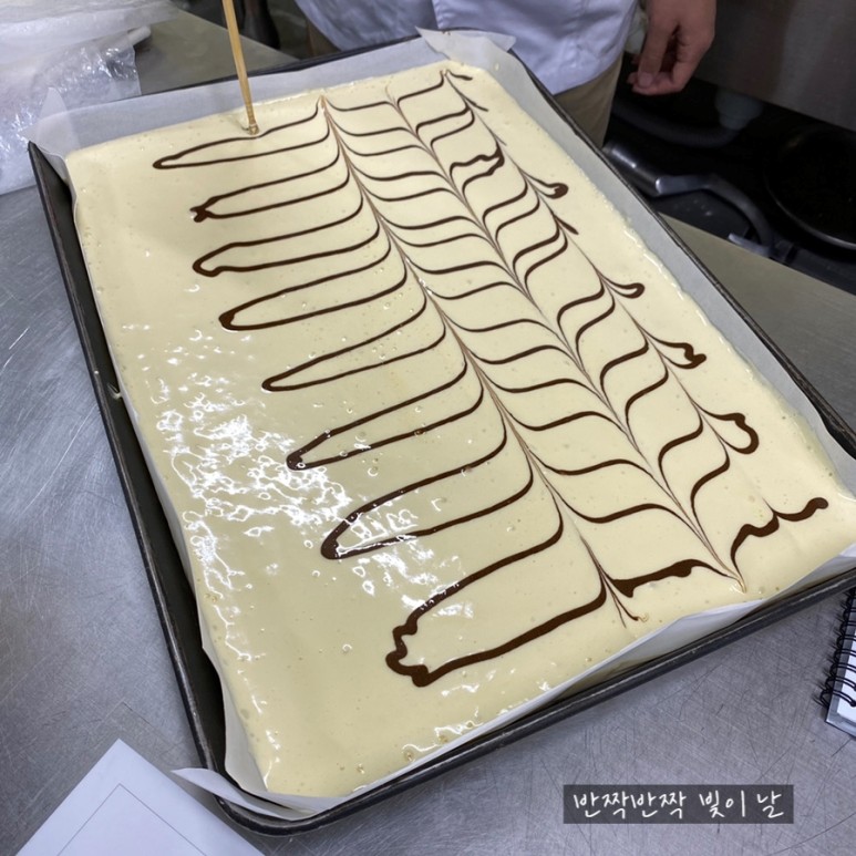 3. 패닝한 반죽 표면에 일정한 간격(2.5cm)을 유지하면서 평철판의 좁은 방향으로 지그재그로 짠다.4.모양을 좁힌 90°방향으로 나무젓가락뒤(굵은편)를 이용하여 일정한 간격(2.5cm)으로 지그재그 모양을 완성한다.★ 젓가락으로 반죽의 2/3정도 깊이로 찔러서 철판 바닥에 닿지 않도록 무늬를 낸다. 반죽을 패닝한 뒤 무늬를 넣을 때까지는 속도를 빠르게 해야 한다. 그렇지 않으면 기포가 올라 제품에 검은 반점으로 나타난다.