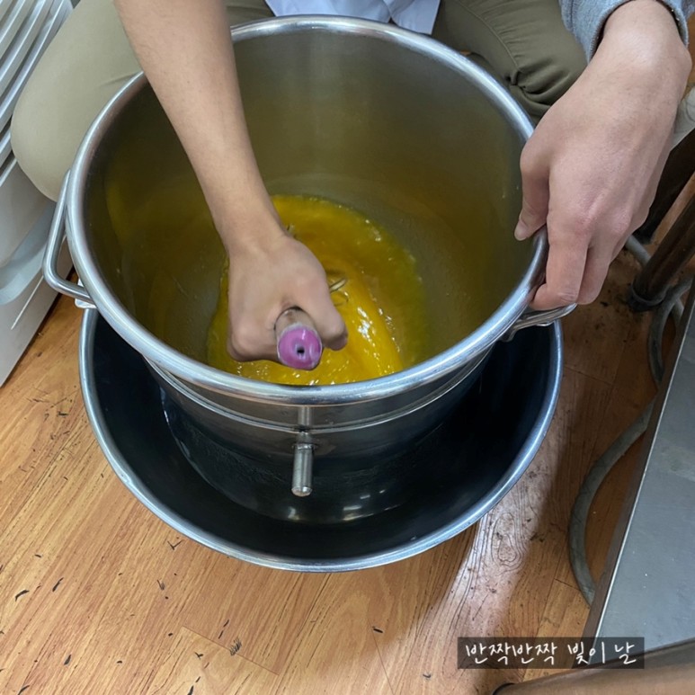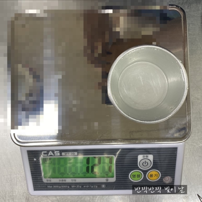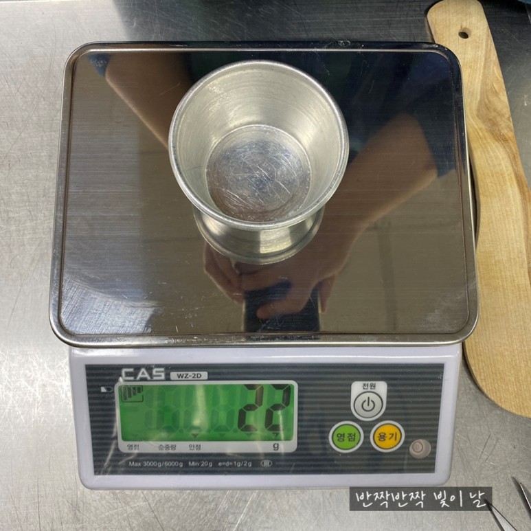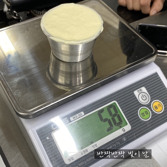 8. 비중계 0.50.05 비중이 낮으면 비중이 맞을 때까지 나무주걱으로 섞는다.★ 나무주걱으로 반죽을 떠서 흘렸을 때 반죽이 점성을 가지고 일정한 간격을 유지하면서 흘러내리는 정도가 적당할 것으로 보이지만 너무 비중이 높지 않도록 주의할 것.