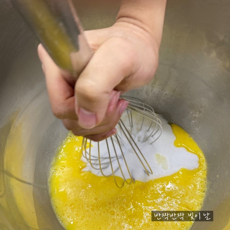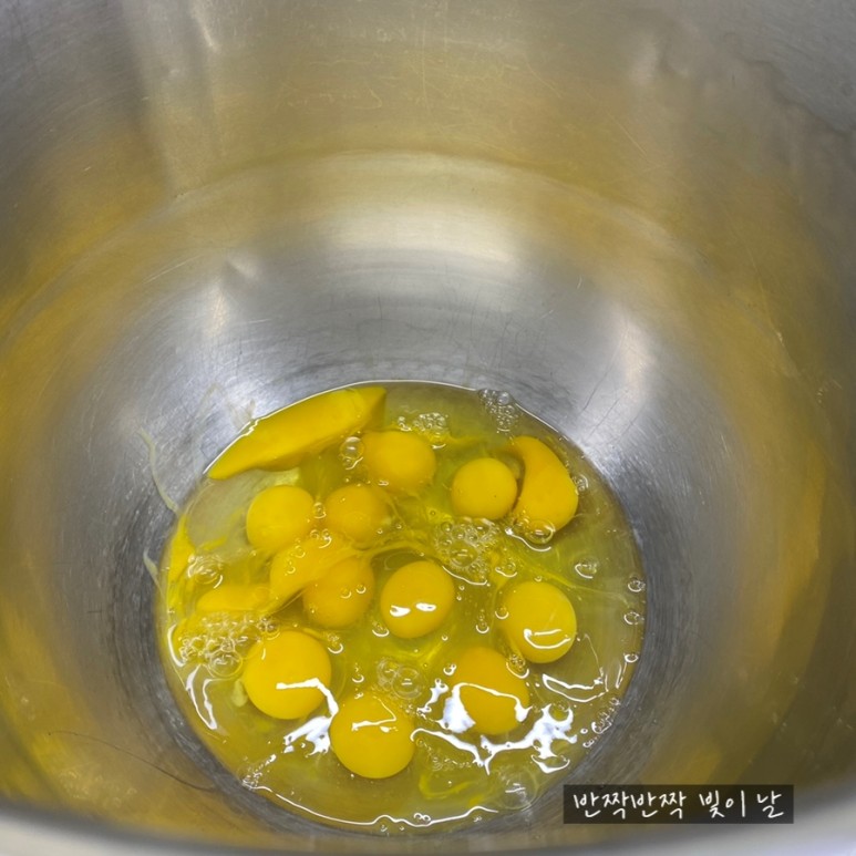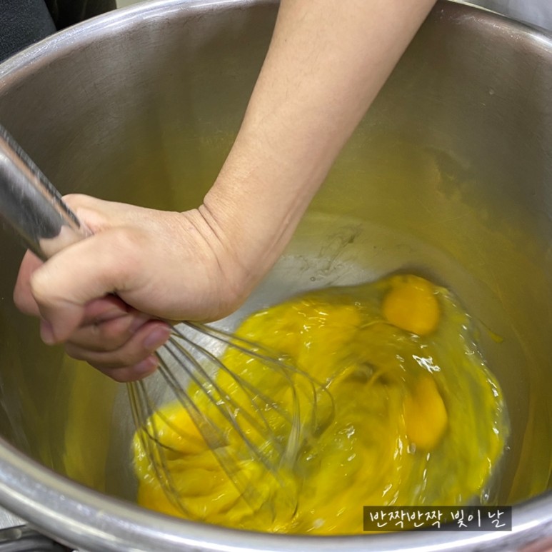 【반죽】반죽공립법, 23℃ 1. 계란을 믹싱볼에 넣고 휘퍼로 골고루 섞는다.