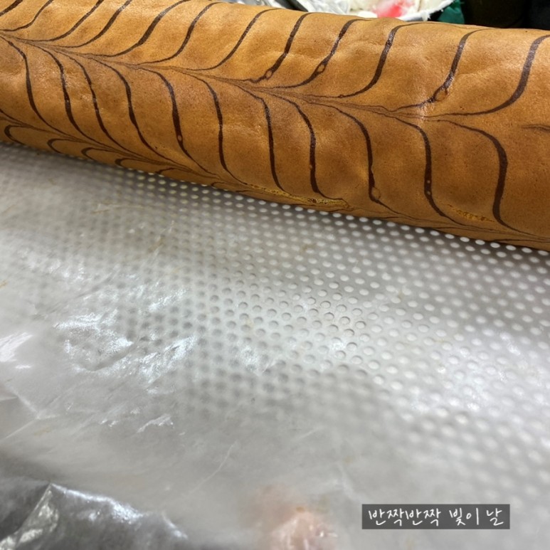 [말기] 1. 오븐에서 꺼낸 시트를 타공팬에 옮긴다. 5분 정도 발효실에 넣어두거나 발효실에 넣어두지 못할 경우 물에 적셔 짠 면포(무명)를 수분이 튀지 않도록 제품에 덮어준다.★너무 뜨거운 상태에 말려들게 해도 제품이 찢어지는 원인이 될 수 있다.