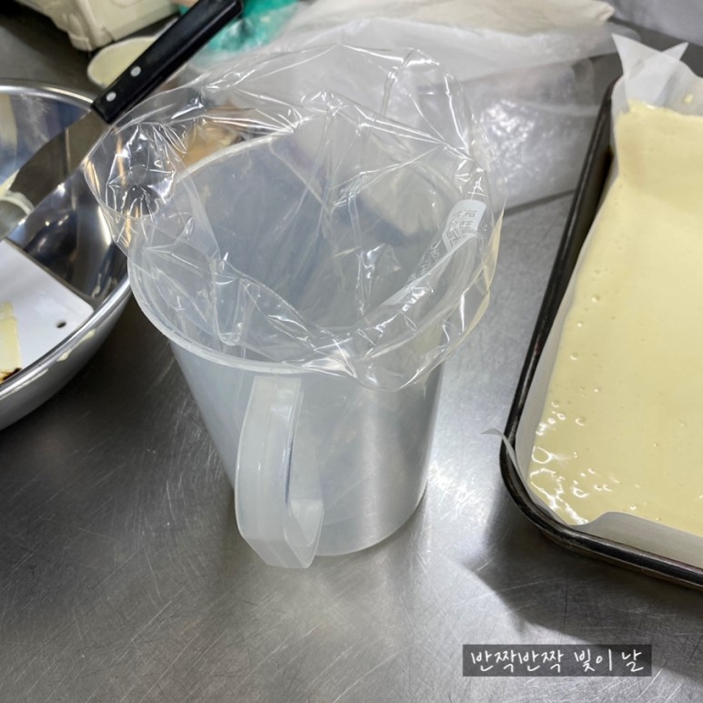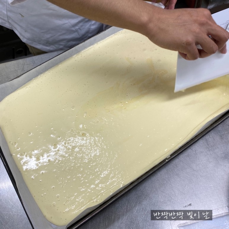 [패닝] 1. 유산지 깔린 평철판에 치환용으로 사용할 반죽 소량만 남기고 전체 반죽을 평철판의 중앙에 붓는다.