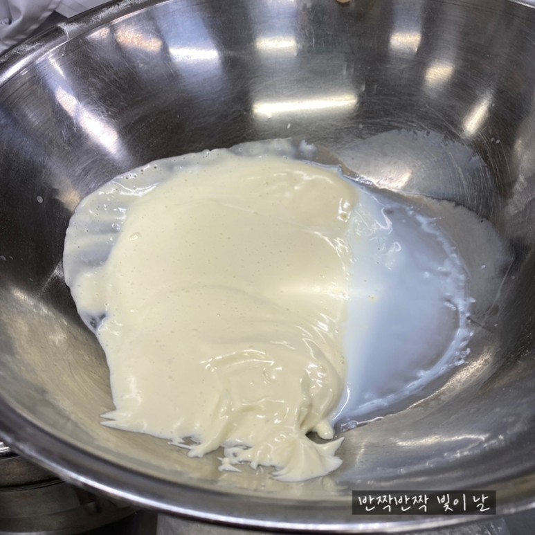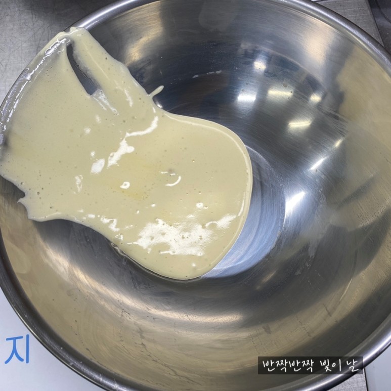 [7-2방법] ◆다 된 휘핑에 채썬 가루재를 넣고, 밀가루가 보이지 않을 정도로 가볍게 섞는다.㉡ ᅦ に에 뜨거운 물에 데운 우유를 넣어 물기가 보이지 않을 정도로 가볍게 섞는다.★ 반죽을 너무 반죽하면 거품이 줄어들고, 비중이 높아지므로 적당히 가볍게 반죽할 것.※ 저희 조는 7-2번 방법으로 원단을 완성했고, 다른 조는 7-1번 방법을 사용했는데 결과를 비교해보면 거의 차이가 없었어요. 이 제품의 키포인트는 비중을 얼마나 잘 맞추느냐와 반죽을 얼마나 잘 섞었느냐가 롤케이크 시트의 완성도를 좌우할 것으로 보인다.
