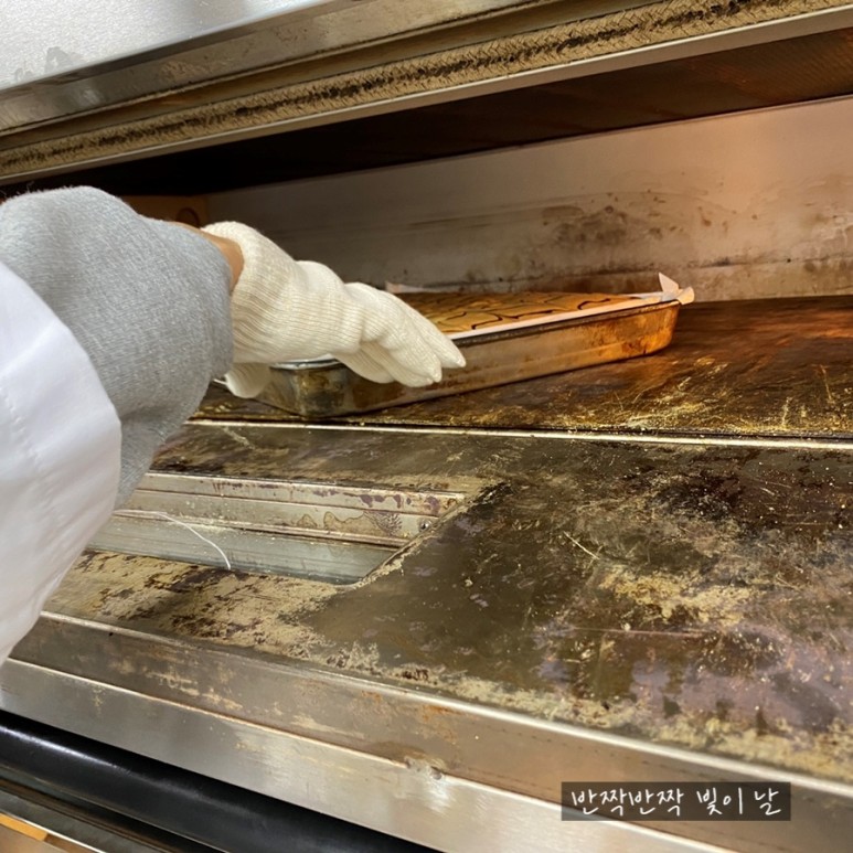 [굽기]윗불 190도, 아랫불 160도, ±15~20분 1. 오븐에 넣기 전에 평철판을 바닥에 치는 태핑으로 윗부분의 큰 공기방울을 제거한다.2. 오븐에 넣고 10분 정도 지나면 프라이팬의 위치를 반대로 바꿔 전체 제품의 색상이 균일하게 유지되도록 한다.★원래 교재는 윗불을 175℃로 하고 있으나, 175℃에서 색이 나올 때까지 구워 주면 통째로 세탁한다. 이처럼 아랫불 온도가 160도보다 높으면 이빨도 닦지 않을 때 터지는 원인이 된다.3. 반죽이 익으면 위에서 살짝 밀었을 때 싹 사라지는 느낌이 없고 탱글탱글 금방 나와야 꺼낼 수 있다.