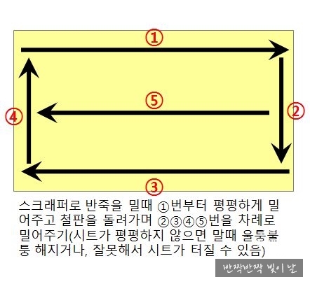 5.면보에 무늬가 있는 부분이 밑에 가게의 시트를 덮고 시트지에 물을 분무하거나 바르고 종이를 벗긴다.